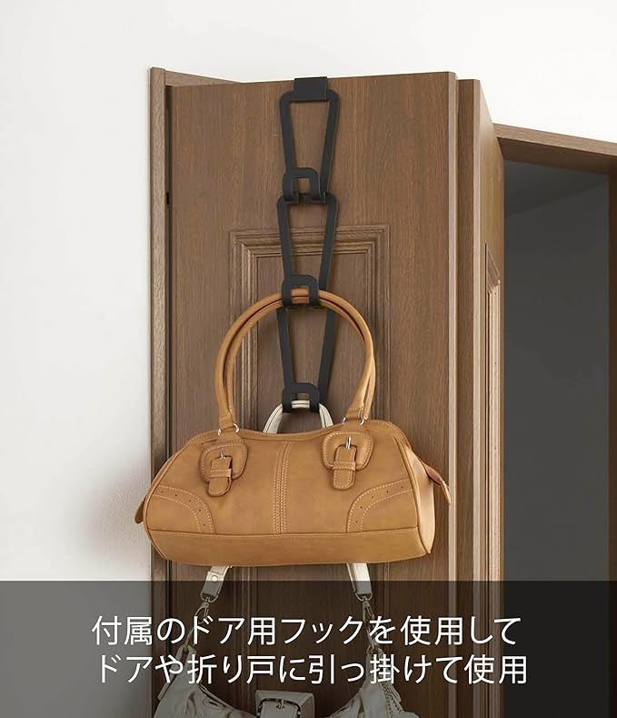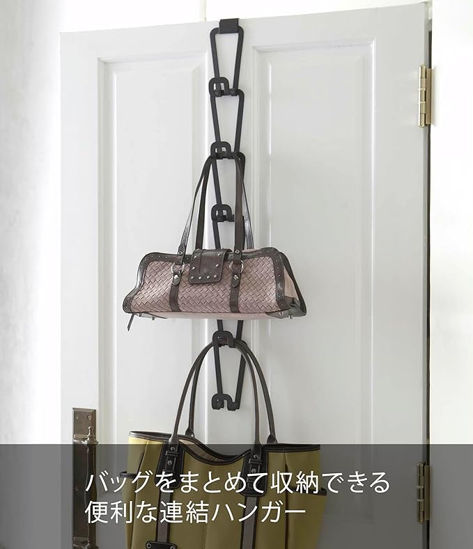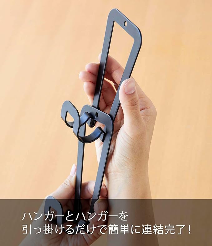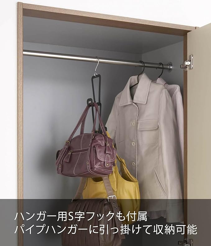 バッグをまとめて収納できる便利な連結ハンガー。ハンガーとハンガーを引っ掛けるだけ。付属のハンガー用ラックを使ってクロゼットの中に収納。壁面側なら縦に4段連結可能。バッグをまとめて収納できる便利な連結ハンガー。ハンガーとハンガーを引っ掛けるだけ。付属のハンガー用ラックを使ってクロゼットの中に収納。壁面側なら縦に4段連結可能。