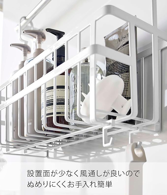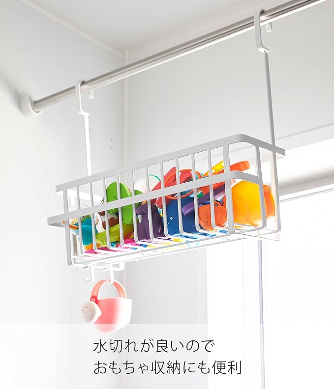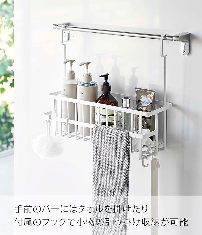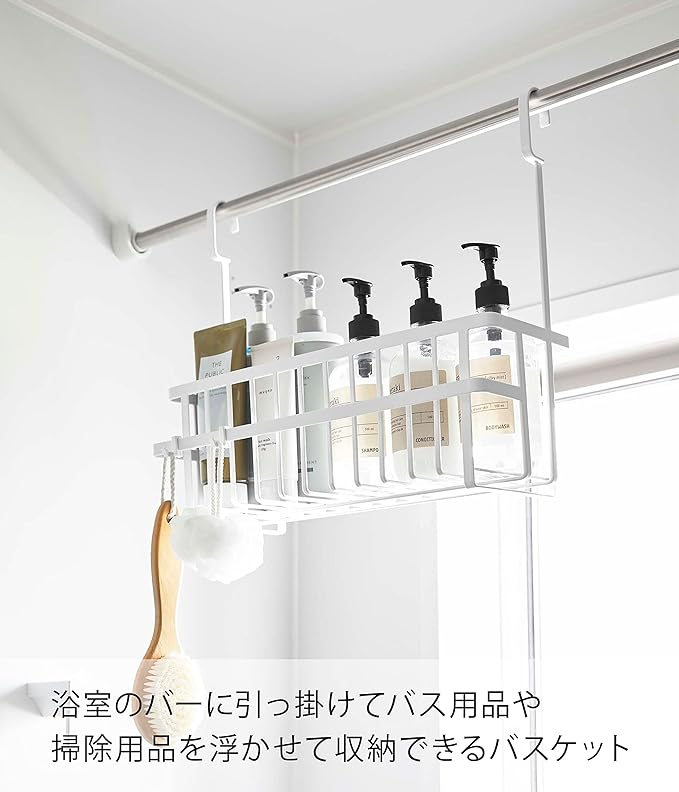バスグッズをなんでも収納。引っ掛けられるバスケット ランドリーパイプに引っ掛けて、バス用品や掃除用品を浮かせて収納できるワイドな大容量バスケットです。設置面が少なく、風通しがよいのでヌメリにくくお手入れ簡単。手前のバーにはタオルなどを掛けておけます。風通しがよく、乾きやすい浴室扉のハンドルに浮かせて収納したり、入浴時には床に置いて使用することもできます。風呂イスに座ったままでもディスペンサーなどが取り出しやすい高さ設計です。どんなバスルームにも合う、2色のカラーバリエーション カラーは、清潔感のあるホワイト、スタイリッシュなブラックをご用意しました。どんなタイプの浴室でもなじむモノトーンカラーです。壁や床の色、バスチェアなどのアイテムに合わせてお好みのカラーをお選びください。ボトル、チューブ、ジャーをまとめて収納 シャンプー、コンディショナー、ボディソープなどのボトル類をまとめて一つのバスケットに収納。物干し竿やタオルバーに引っ掛ければ風通しが良くヌメリの防止にも。洗顔フォームなどのチューブ類、ジャータイプのトリートメントも収納可能です。お掃除アイテムもバスケット収納がGOOD 浴室用のお掃除グッズ入れとして使っても。洗剤やスポンジのほか、置き場所に困りがちなバススリッパもバスケットの中に入れちゃうのがおすすめ。スキージー、ブラシなどは付属のフックを使って吊り下げ収納もできちゃいます。こまごまとしたお風呂用おもちゃの収納にも 子どものおもちゃ入れにもぴったりです。水に濡らして楽しむ絵本、壁面にペタっとくっつけるパズル、水鉄砲、ジョウロなどお風呂遊び用のおもちゃはまとめてバスケットにIN。 こまごまとしたおもちゃはそのままポイポイと入れるだけ。