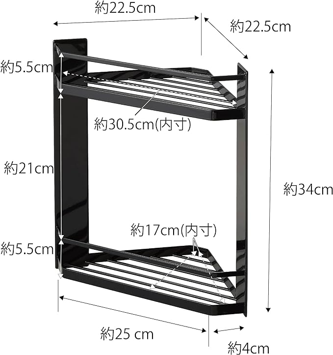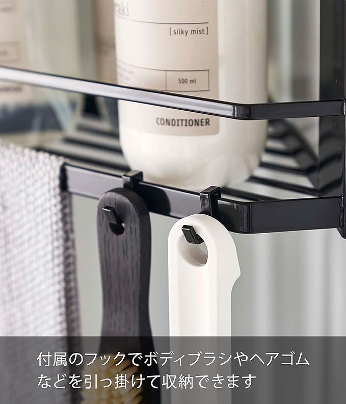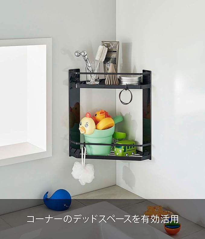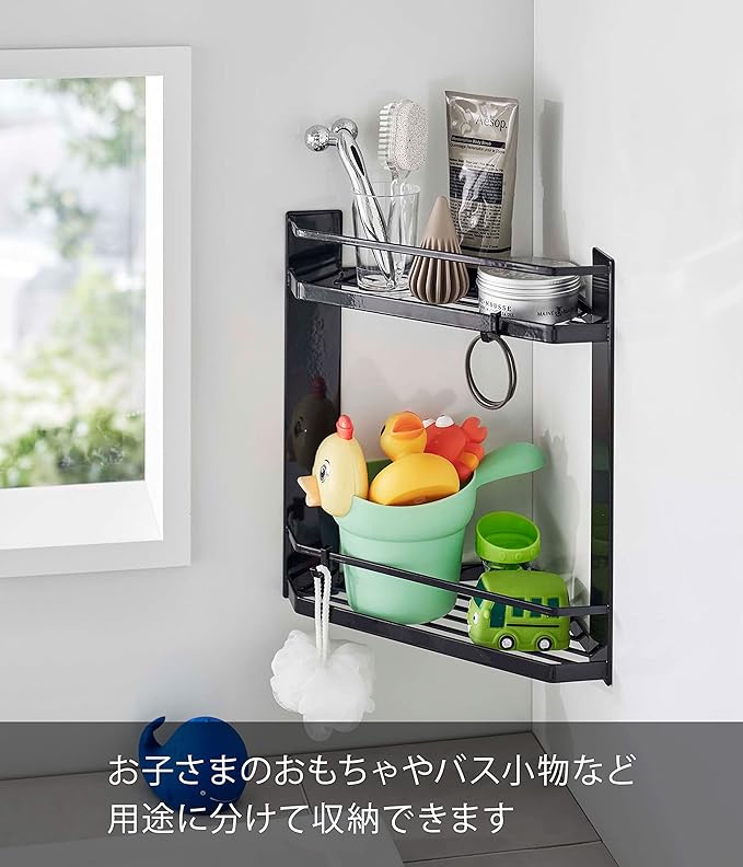 バスルームのコーナーにマグネットで簡単取り付けできる2段のコーナーラック。コーナーに収納できるのでデッドスペースを有効活用できます。棚は水切れの良いスリット構造。お子様のおもちゃやバス小物など用途に分けて収納。フック付きなので吊るして水切りも可能。ボディブラシやヘアゴムなどを引っ掛けて収納できます。