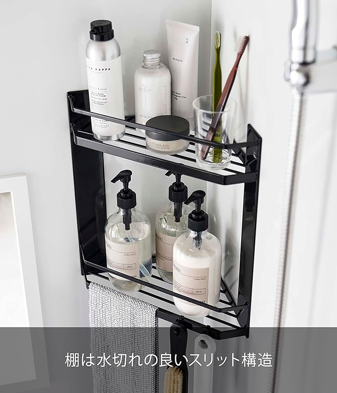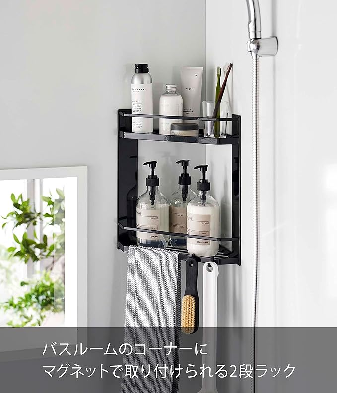 tower マグネット バスルーム コーナーラック 2段 ブラック 浴室収納 浮かせるラック 水切り