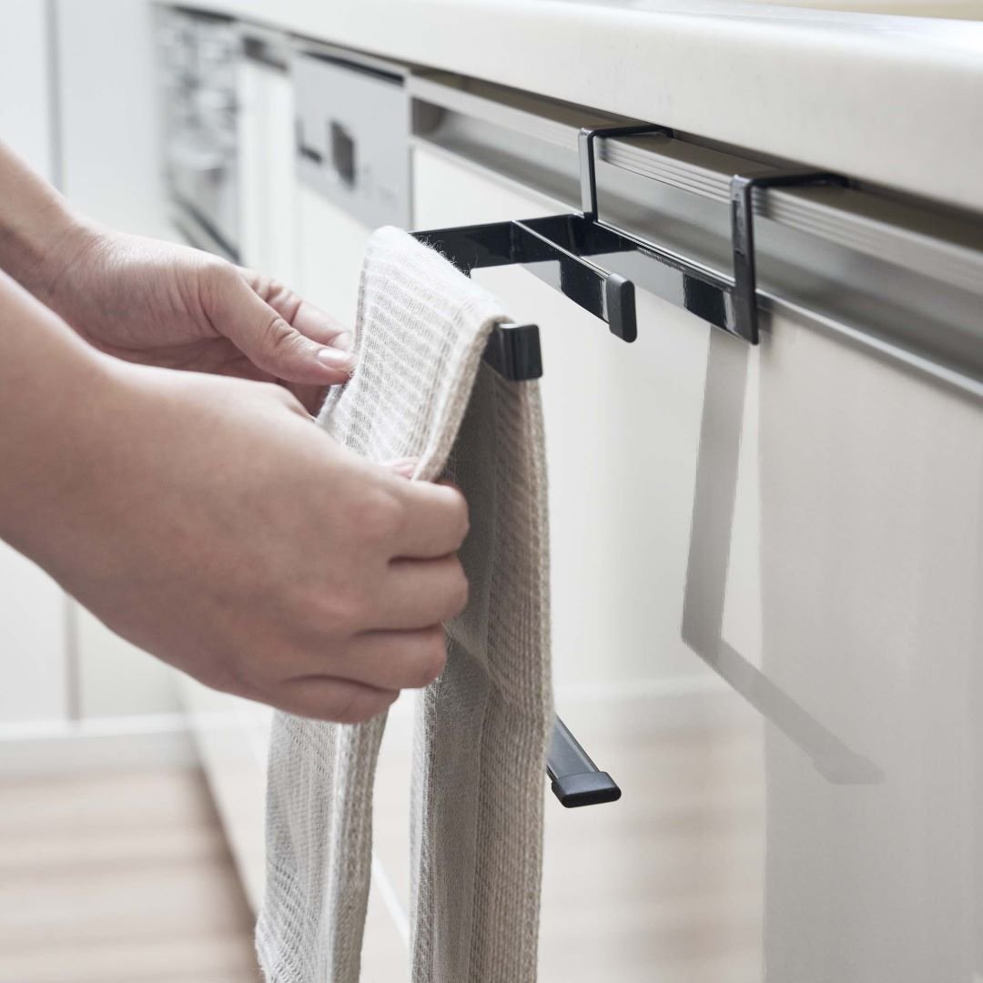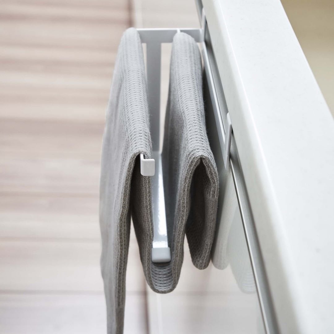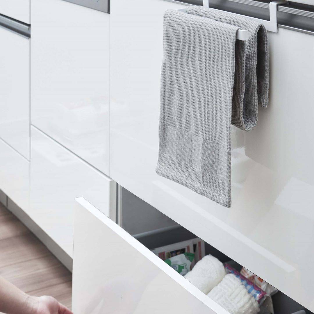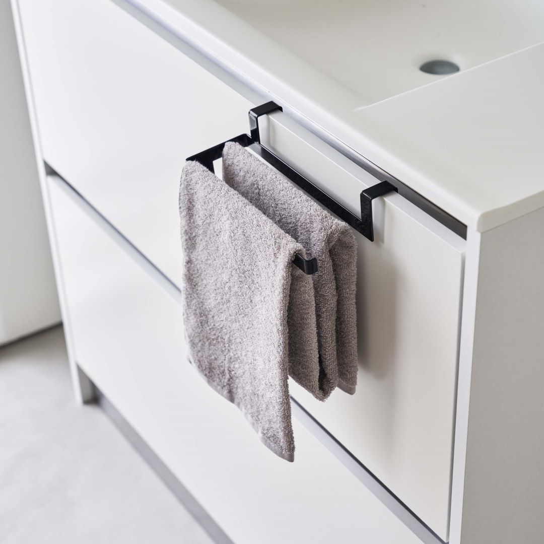 タオルの長さを調節できるタオルハンガー 布巾やタオルの長さを調節できるタオルハンガーです。スポーツタオルはフェイスタオルより厚手で長さがあるため、家族の多いご家庭や洗顔後に使用するのに選ばれる方も多いのでは。タオルが長いことで下段の引き出しに挟まれたり、床に着きそうになったりする悩みを解決できるアイテムです。水回りになじみやすい2つのカラー カラーは王道のホワイトと、落ち着いた印象のブラックの2色をご用意いたしました。取り付ける場所や家具の色味などに合わせて、お好みのカラーをお選びいただけます。マットな質感とシンプルなデザインで、備え付けのような一体感があります。蛇腹折りだから早く乾いて、雑菌や臭いを抑える シンク下や洗面所下などの扉部分に引っかけられるようになっています。一般的なふたつ折りのタオルハンガーはタオルの接触面が多いため乾燥しにくく、雑菌の繁殖や臭いが気になります。こちらのタオルハンガーは蛇腹折りのようにタオルを掛けるので風通しが良く、早く乾かしながら収納できます。子どもにも優しい仕様 洗面台の壁にある備え付けのタオル掛けは大人にとってちょうどいい高さでも、子どもは踏み台に登らないと届かないご家庭にもぴったりです。シリコーンキャップ付きなので、お子様が引っ張ってタオルがズレ落ちるのを防止してくれるのも嬉しいポイント。水やサビに強いから水回りの使用も安心 水やサビに強い丈夫なスチール素材を採用しています。洗面台やキッチンなどの濡れやすいところでの使用も安心です。平面の流し台や洗面台などの扉に取り付けるため穴開けが不要で、賃貸の方にも使用できるアイテムです。