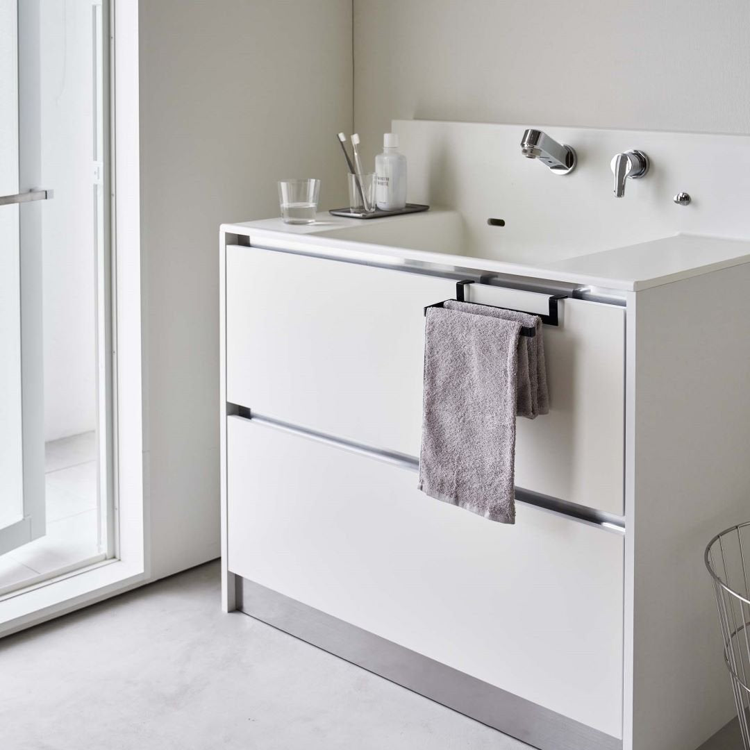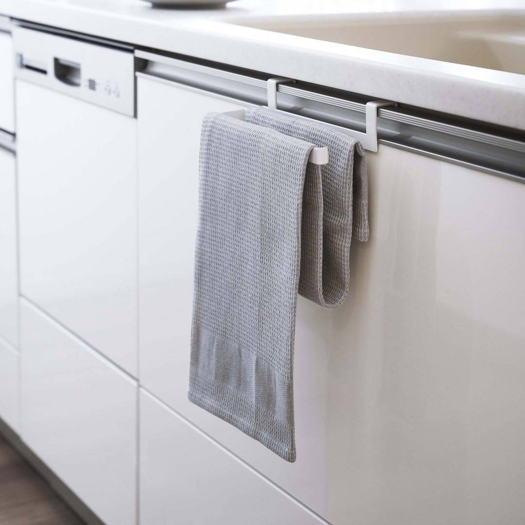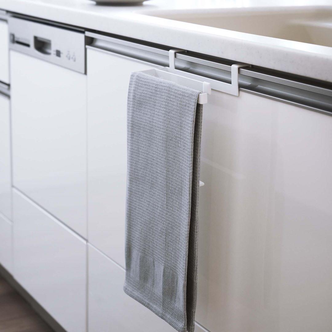 タオルの長さを調節できるタオルハンガー 布巾やタオルの長さを調節できるタオルハンガーです。スポーツタオルはフェイスタオルより厚手で長さがあるため、家族の多いご家庭や洗顔後に使用するのに選ばれる方も多いのでは。タオルが長いことで下段の引き出しに挟まれたり、床に着きそうになったりする悩みを解決できるアイテムです。水回りになじみやすい2つのカラー カラーは王道のホワイトと、落ち着いた印象のブラックの2色をご用意いたしました。取り付ける場所や家具の色味などに合わせて、お好みのカラーをお選びいただけます。マットな質感とシンプルなデザインで、備え付けのような一体感があります。蛇腹折りだから早く乾いて、雑菌や臭いを抑える シンク下や洗面所下などの扉部分に引っかけられるようになっています。一般的なふたつ折りのタオルハンガーはタオルの接触面が多いため乾燥しにくく、雑菌の繁殖や臭いが気になります。こちらのタオルハンガーは蛇腹折りのようにタオルを掛けるので風通しが良く、早く乾かしながら収納できます。子どもにも優しい仕様 洗面台の壁にある備え付けのタオル掛けは大人にとってちょうどいい高さでも、子どもは踏み台に登らないと届かないご家庭にもぴったりです。シリコーンキャップ付きなので、お子様が引っ張ってタオルがズレ落ちるのを防止してくれるのも嬉しいポイント。水やサビに強いから水回りの使用も安心 水やサビに強い丈夫なスチール素材を採用しています。洗面台やキッチンなどの濡れやすいところでの使用も安心です。平面の流し台や洗面台などの扉に取り付けるため穴開けが不要で、賃貸の方にも使用できるアイテムです。