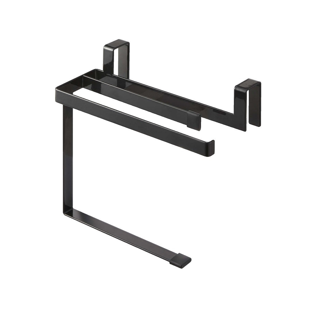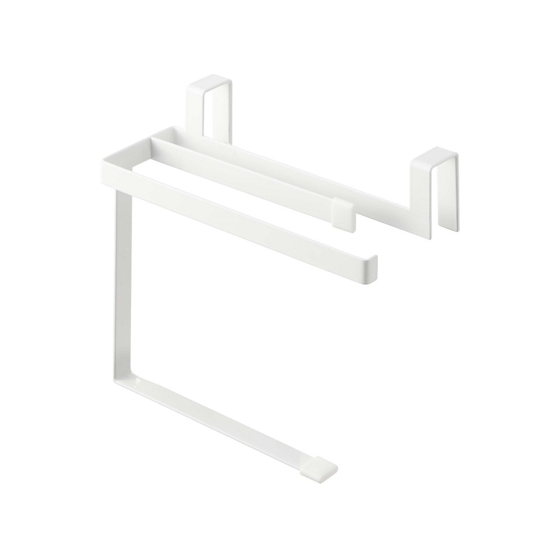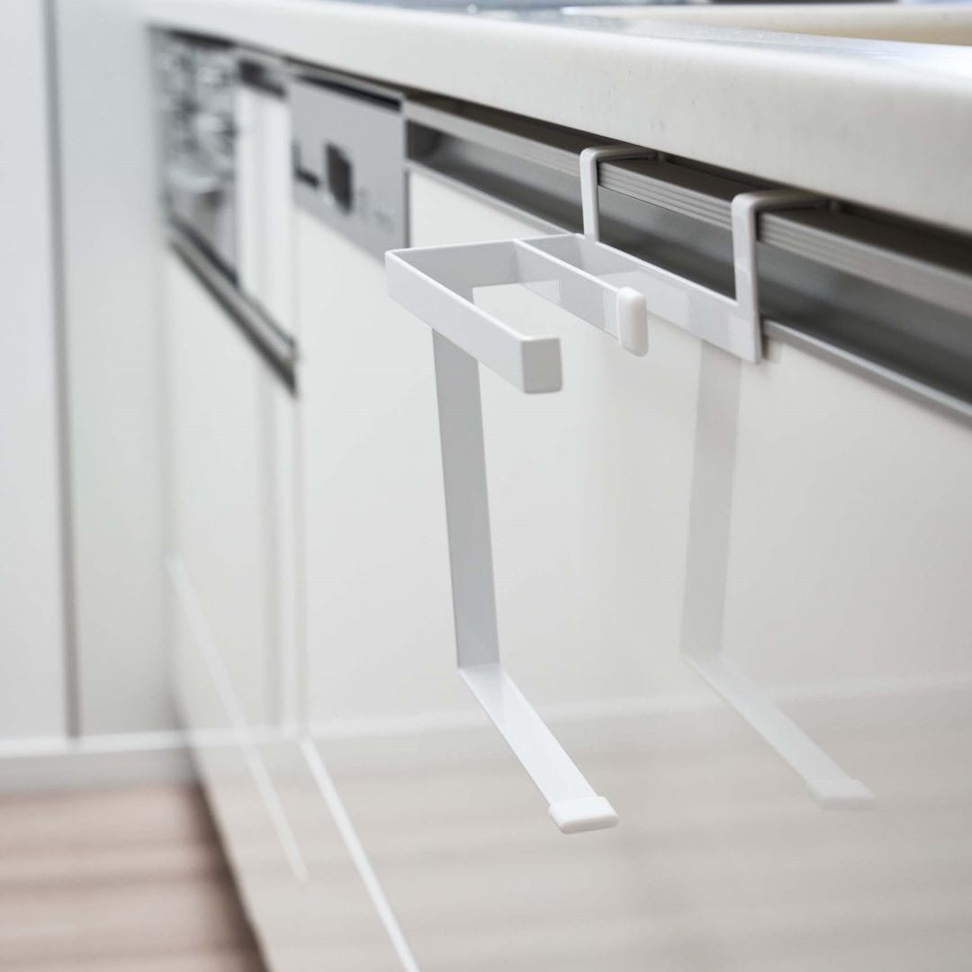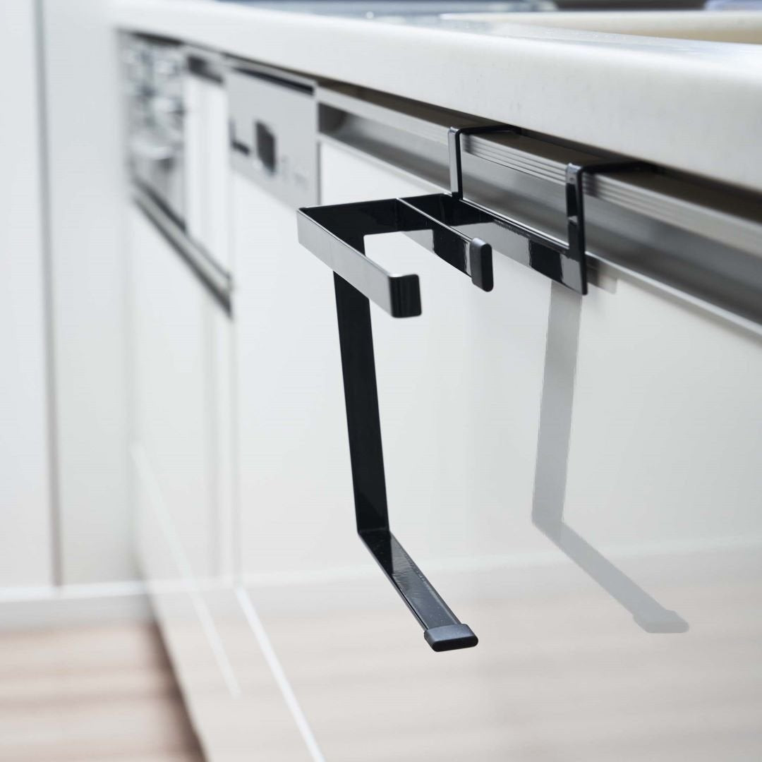 タオルの長さを調節できるタオルハンガー 布巾やタオルの長さを調節できるタオルハンガーです。スポーツタオルはフェイスタオルより厚手で長さがあるため、家族の多いご家庭や洗顔後に使用するのに選ばれる方も多いのでは。タオルが長いことで下段の引き出しに挟まれたり、床に着きそうになったりする悩みを解決できるアイテムです。水回りになじみやすい2つのカラー カラーは王道のホワイトと、落ち着いた印象のブラックの2色をご用意いたしました。取り付ける場所や家具の色味などに合わせて、お好みのカラーをお選びいただけます。マットな質感とシンプルなデザインで、備え付けのような一体感があります。蛇腹折りだから早く乾いて、雑菌や臭いを抑える シンク下や洗面所下などの扉部分に引っかけられるようになっています。一般的なふたつ折りのタオルハンガーはタオルの接触面が多いため乾燥しにくく、雑菌の繁殖や臭いが気になります。こちらのタオルハンガーは蛇腹折りのようにタオルを掛けるので風通しが良く、早く乾かしながら収納できます。子どもにも優しい仕様 洗面台の壁にある備え付けのタオル掛けは大人にとってちょうどいい高さでも、子どもは踏み台に登らないと届かないご家庭にもぴったりです。シリコーンキャップ付きなので、お子様が引っ張ってタオルがズレ落ちるのを防止してくれるのも嬉しいポイント。水やサビに強いから水回りの使用も安心 水やサビに強い丈夫なスチール素材を採用しています。洗面台やキッチンなどの濡れやすいところでの使用も安心です。平面の流し台や洗面台などの扉に取り付けるため穴開けが不要で、賃貸の方にも使用できるアイテムです。