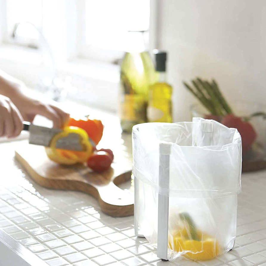 ポリ袋を掛けて調理中にでる野菜クズや資源ゴミを、その場で捨てることができる卓上ゴミ箱です。食卓のミニゴミ箱としても便利です。使わないときは折り畳んでスリムに収納可能です。