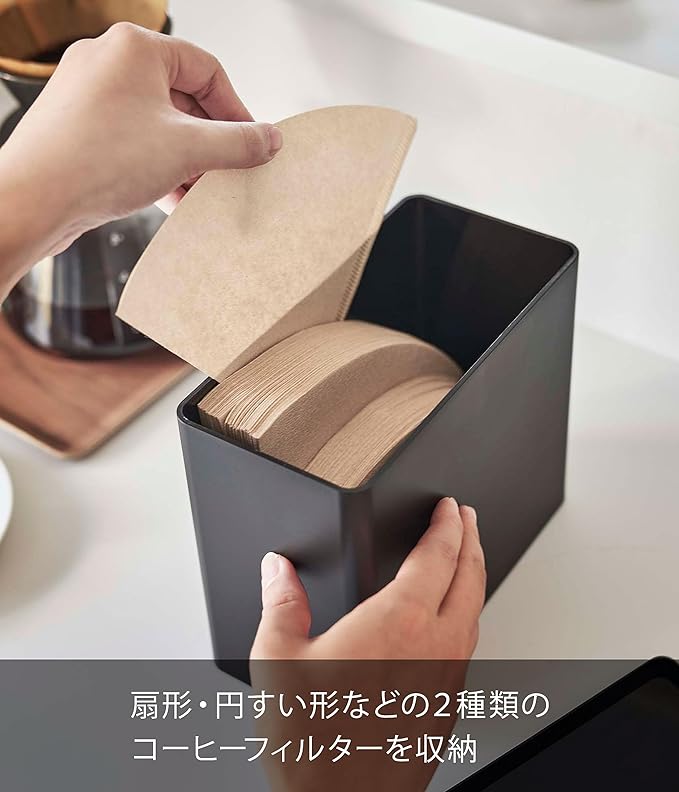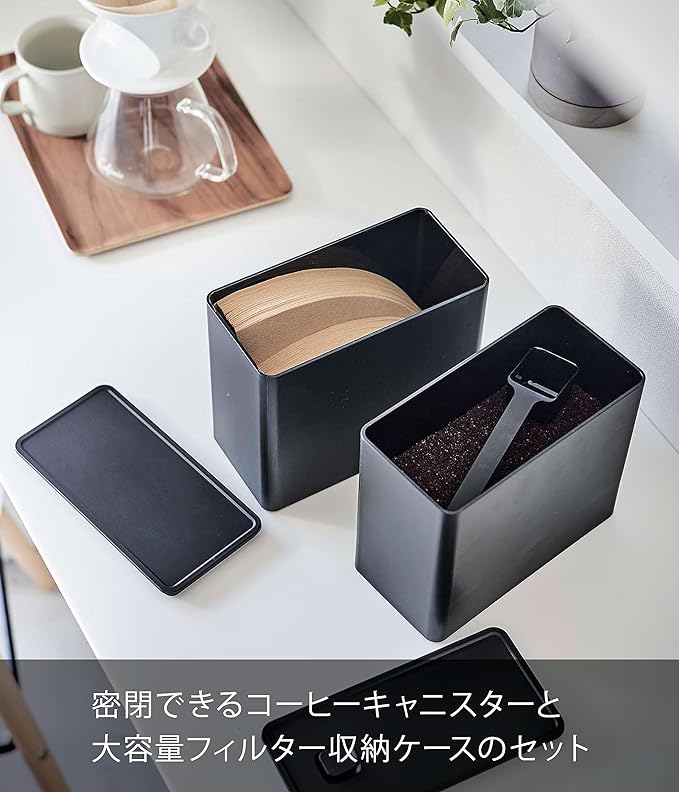 最後までコーヒー粉がきれいにすくえるコーヒーキャニスターと大容量フィルター収納ケースのセット。積み重ねて収納できるので、幅を取らずにスリムに収納。コーヒーペーパーフィルター収納は蓋付きでほこりやゴミが付きにくく衛生的。扇形・円すい形など2種類のペーパーフィルターを約200枚収納できます。海外用の大きいサイズも収納可能。フィルター以外にも、砂糖やマドラー、コーヒーカプセルの収納にも便利です。コーヒーキャニスターは底の形が付属のコーヒーメジャーにピッタリフィット。最後までコーヒー粉をきれいにすくえます。角度が付いたメジャースプーンで余分なコーヒー粉が落ちやすく、すりきり棒がなくてもすりきり1杯(約10g)が量れます。パーツはすべて分解して洗えます。バルブをワンプッシュで簡単密閉。コーヒーの劣化を防ぎます。