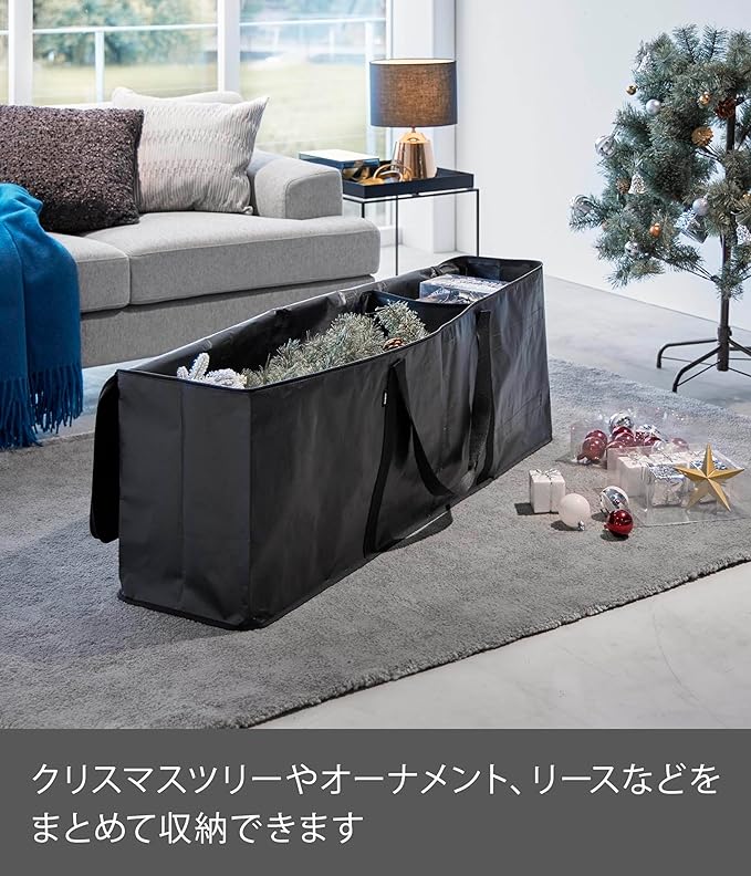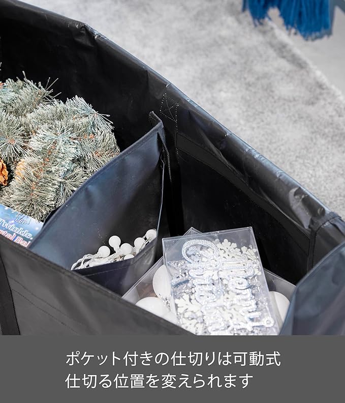 クリスマスツリーやオーナメントをまとめて収納。可動式のポケット付き仕切りが便利な収納バッグです。間口が広いので収納しやすく、ツリーのサイズに合わせて仕切りの移動ができます。布団や衣類などの収納にも便利です。クローゼットや押し入れの空いたスペースに。ベッド下のデッドスペースにすっきり収納。アウトドア用品の収納にも。ポケット付き仕切りは便利な可動式。持ち運びに便利な持ち手付き。