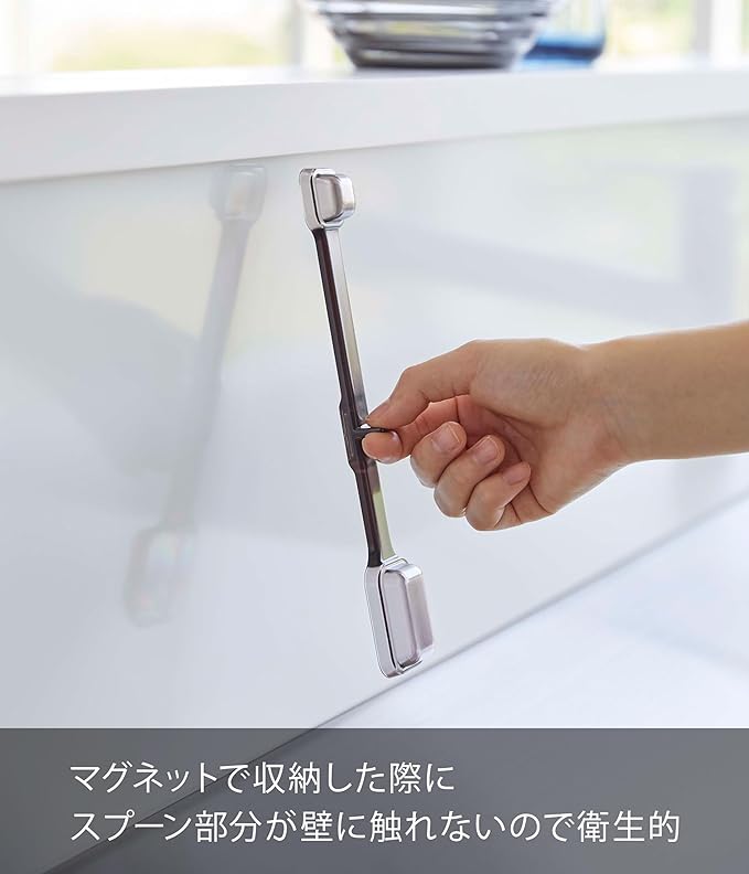 マグネットで壁に浮かせて簡単収納。段差メモリで上から一目で簡単計量。マグネットが内蔵された、計量スプーン。耐熱温度が100℃なので、食洗機に対応しています。置いたまま注げて、計量しやすいデザイン。マグネットで収納した際に、スプーン部分が壁に触れないので衛生的。柄が長いスプーンなので、深い容器の調味料も取り出しやすい。大きいスプーンは大さじ・大さじ1/2。小さいスプーンは小さじ・小さじ1/2が計れます。