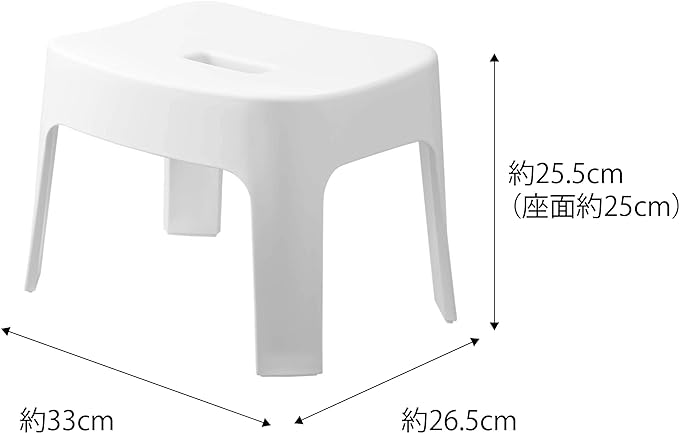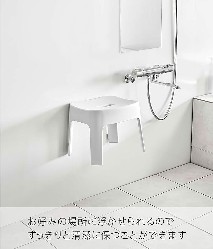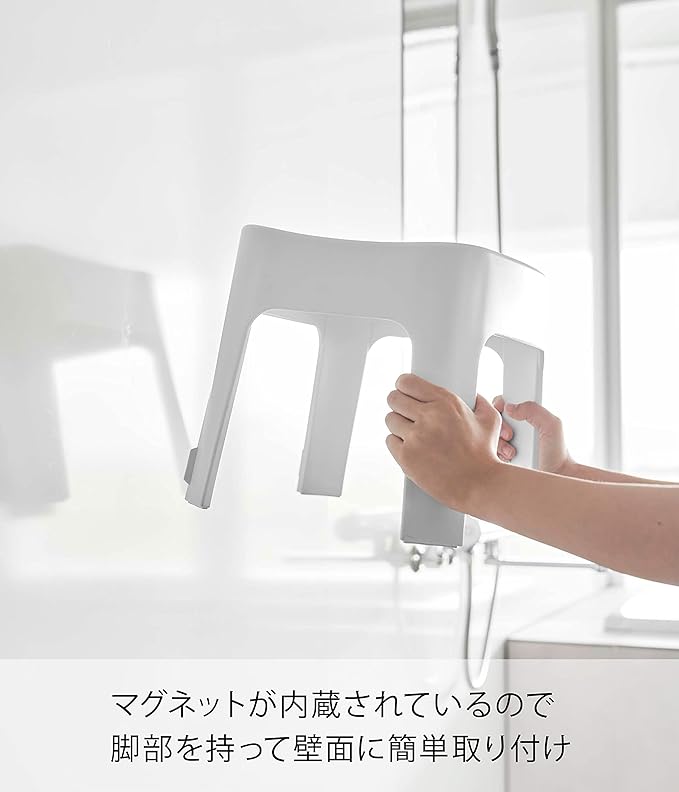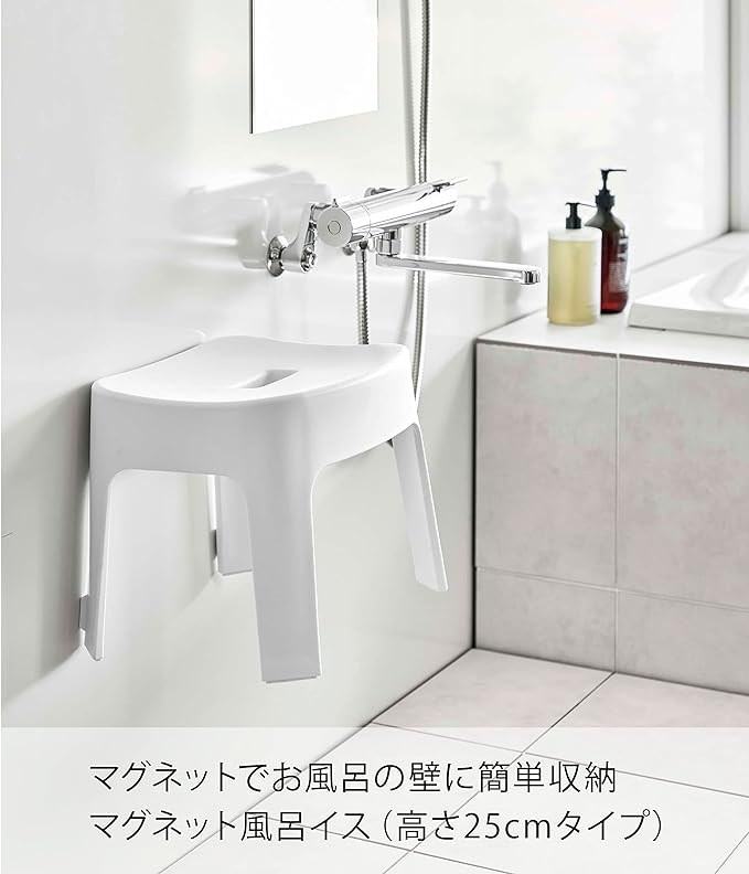 清潔さを保てる『マグネット風呂イス』 背面にマグネットが内蔵され、浴室の壁面にピタッと収納できる風呂イスです。浮かせて収納ができるので、お掃除が楽に。接地面が少ない為、気になるヌメリも最小限に抑えられます。シンプルで合わせやすい2色のカラーバリエーション カラーは清潔感のあるホワイトとシックなブラックの2種類です。モノトーンカラーなので、浴室小物やインテリアにも合わせやすいのが◎。浴室の壁や床の色に合わせて選んでみてください。壁面に付けても、浴槽に引っ掛けても マグネット風呂イスは2way仕様。背面に本体と同色のマグネットがついているので、浴室の壁がスチールやマグネットが付く仕様であれば脚部を持って壁面に簡単取付ができます。マグネット仕様の壁でない場合でも、浴室のフチに引っ掛けて浮かせる収納もできます。転倒防止の滑り止め付で安心安全に使用できる 本体は水を吸わない素材で傷つきにくく、風呂場の使用でも劣化しにくいポリプロピレンを使用。滑り止めとして足の底部にはエラストマーを使用しているので、転倒しやすい浴室でも安心してお使いいただけます。※座面裏側の仕様については、現在仕様変更をしており画像と異なります。予めご了承ください。使用に合わせて選べる2サイズ展開 マグネット風呂イスは座面の高さが異なる2サイズ展開です。こちらの座面の高さ25cmタイプはスタンダードサイズで、幅広い年齢の方でも使いやすいサイズ。サイズ違いの30cmタイプは座りながらでも棚の小物が取りやすかったり、カウンターが使いやすい高さとなります。家族構成に合わせてや、浴室の仕様に合わせて選んでみてください。