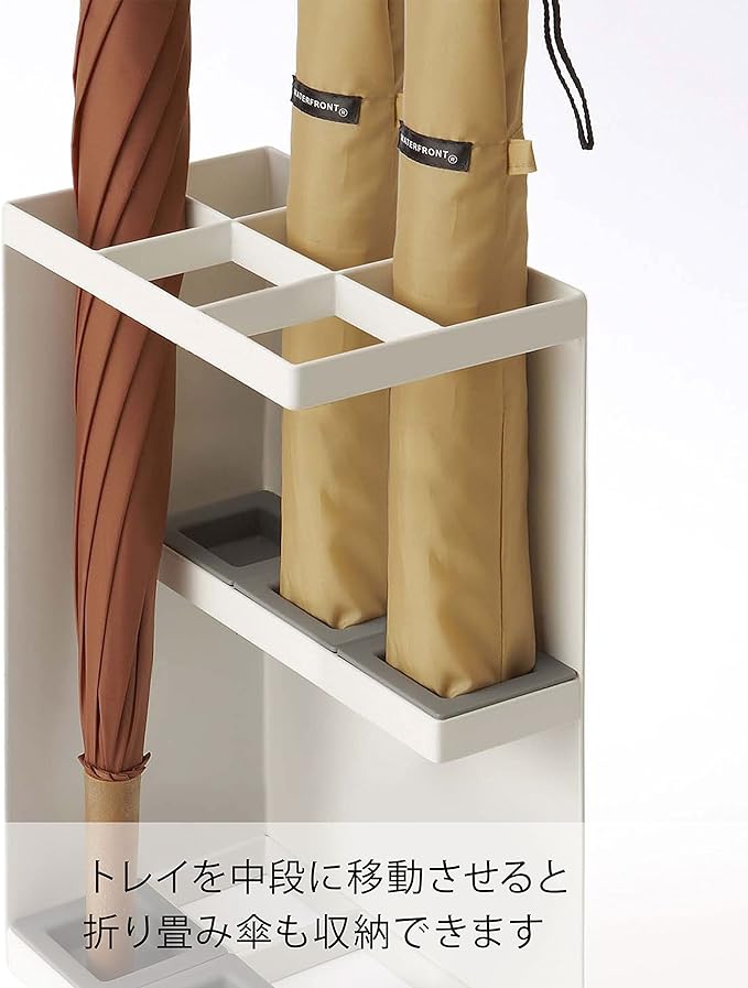 玄関の角にぴったりと収まるコンパクト角型かさたて玄関で場所をとらない省スペースデザイン設計。トレイの位置を変えれば折り畳み傘を収納可能。