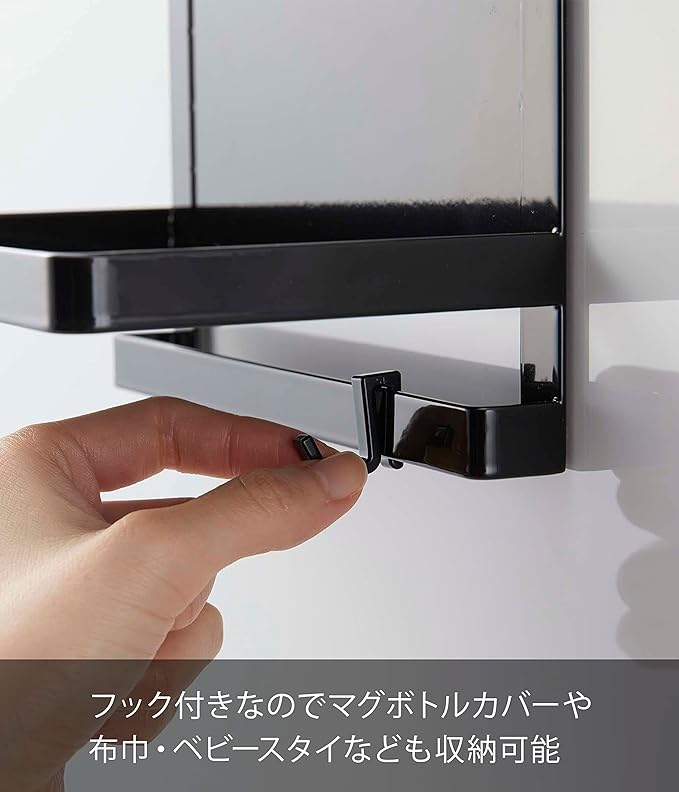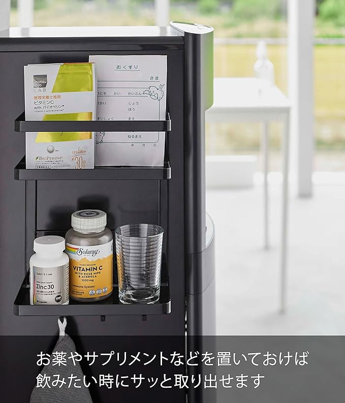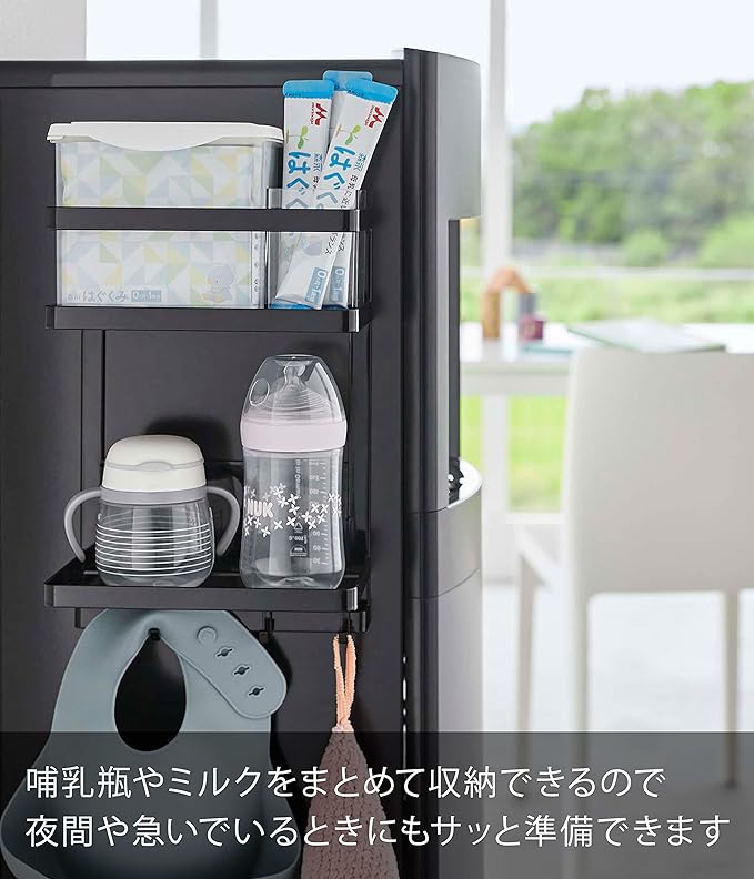 ウォーターサーバーの横にマグネットで簡単取り付け。お薬やサプリメントを一括収納できます。お薬やサプリメントなどを置いておけば、飲みたいときにサッと取り出せます。ウォーターサーバー横にコーヒーやお茶を置けばサッと準備ができます。哺乳瓶や粉ミルクなどをひとまとめにして収納でき、夜中や急いでいる時にも便利です。フック付きでマグボトルカバーやベビースタイ、布巾なども収納可能。冷蔵庫横に設置して調味料置き場にも。