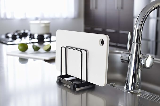置き場所に困るまな板をコンパクトに収納。 シンク周りを使いやすく、美しく整理整頓。置き場所に困るまな板をコンパクトに収納。モダンなブラックでキッチンをシャープに演出します。