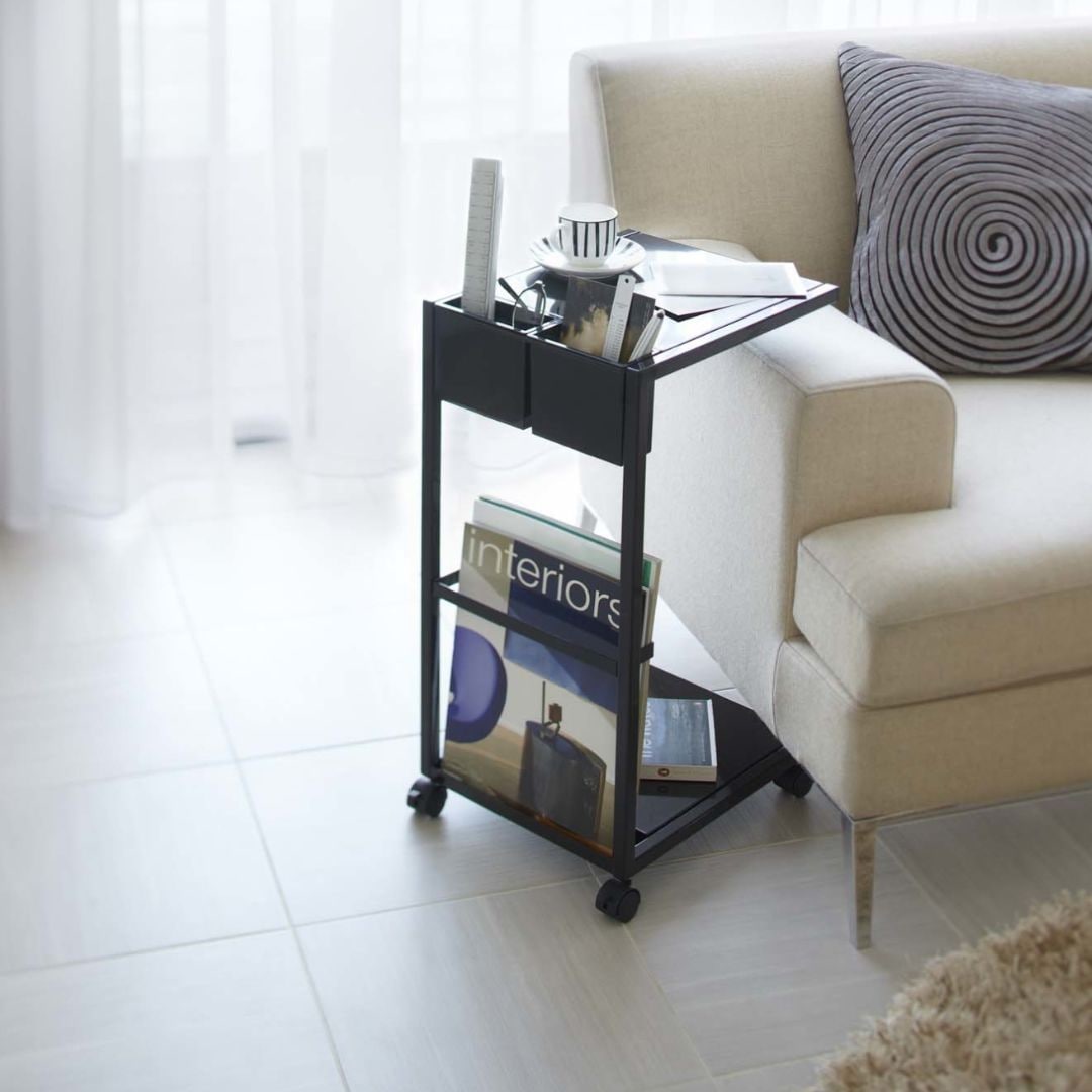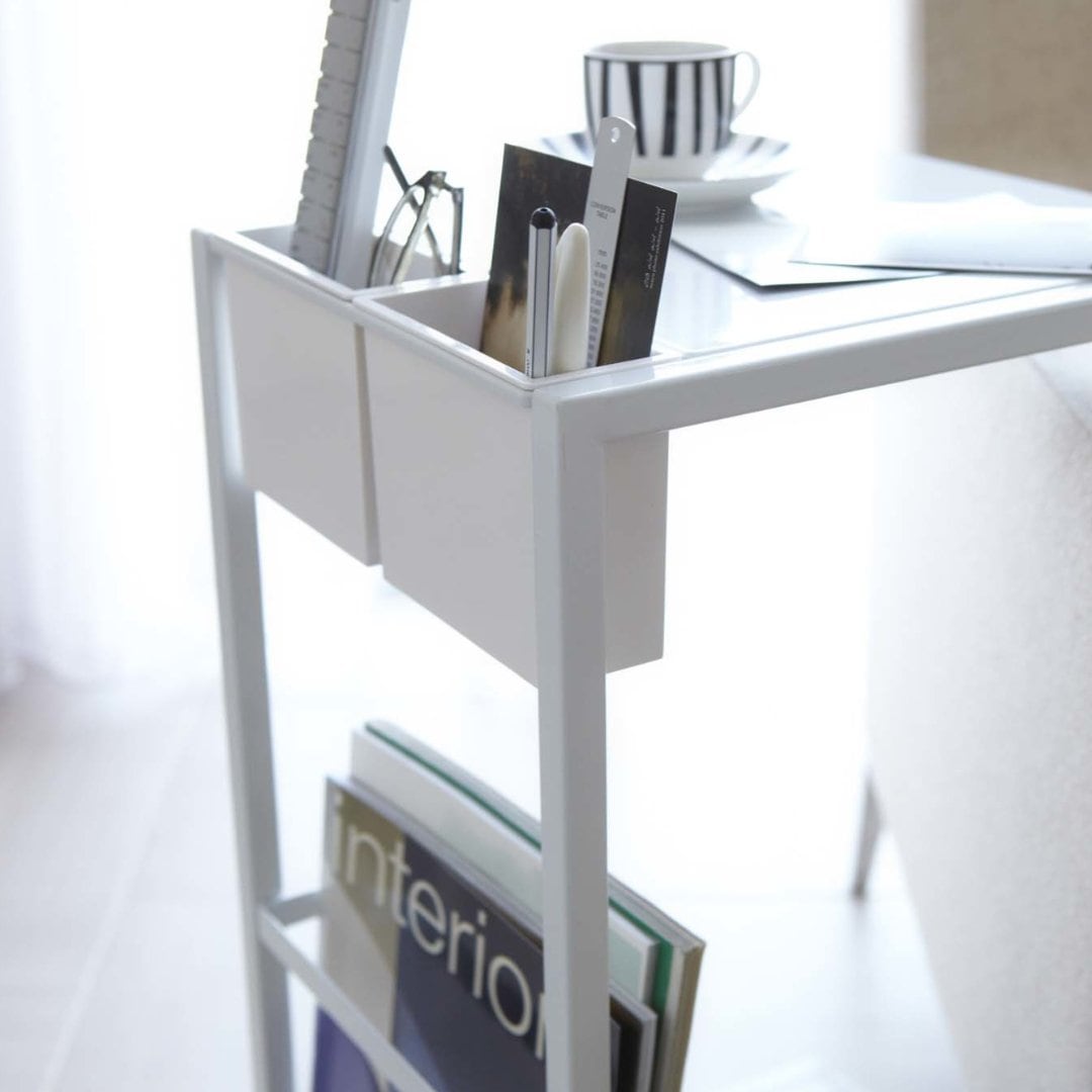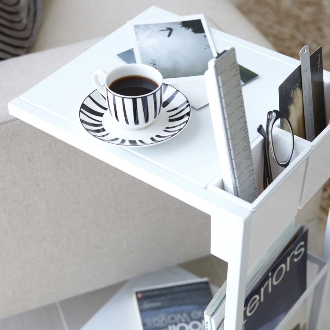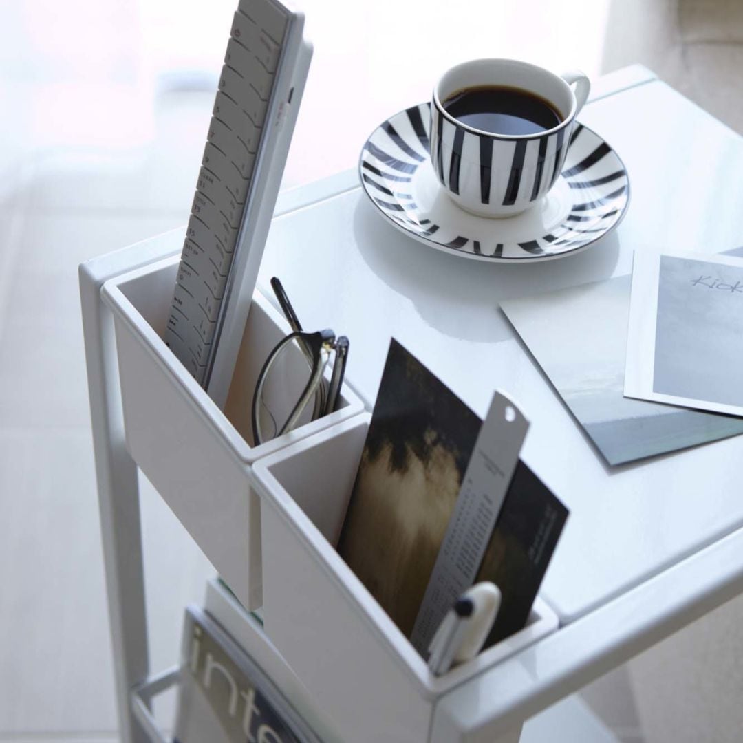 たくさんの機能があり使いやすいサイドテーブルワゴン サイドテーブルワゴンタワーは、多機能で使いやすいデザインが魅力的なアイテムです。まず高い位置にあるテーブル(棚)。ソファに座った状態でもちょどいい高さにテーブルがあるので、飲み物などを置いたり、軽くメモしたりするのにぴったりです。背面側には2つの小さめなポケットがついています。細かいものを収納するのに向いています。ポケットの下にはブックスタンドが付いているので、よく読む雑誌などを収納できます。また、下部にもテーブルと同じサイズの棚が付いていて「ちょっと置いておきたい」ときに使えてとても便利。上下の棚は5キロまで乗せられ、少し重いものを置いても、キャスターが付いているので楽に移動できます。カラーはホワイト、ブラックの2色から選べます カラーバリエーションはどんな部屋にも合うホワイト、ブラックの2色展開。明るく清潔感あふれるホワイト、スタイリッシュでキリリとした印象のブラック。お部屋のイメージに合わせて選んでみてください。