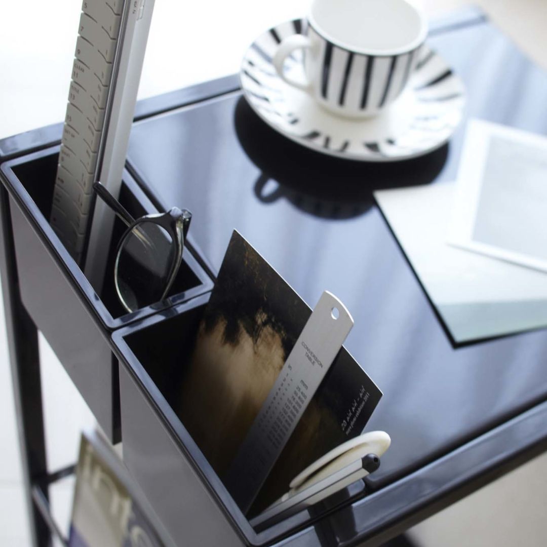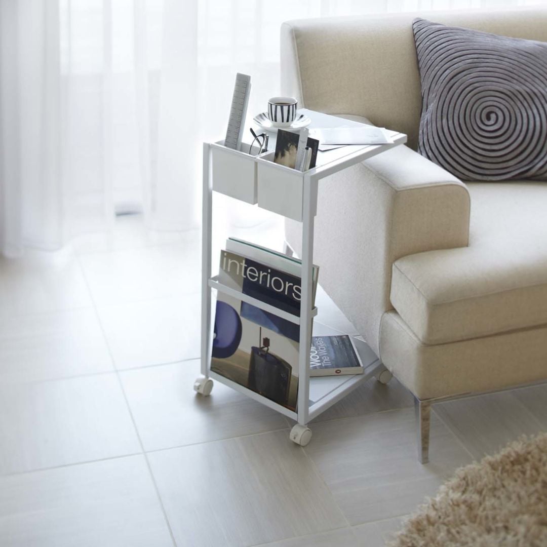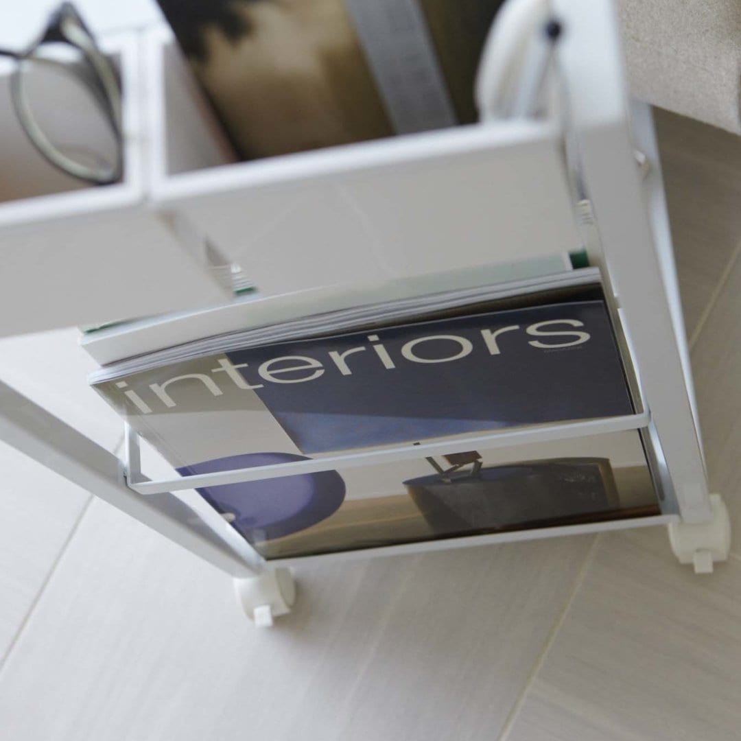 たくさんの機能があり使いやすいサイドテーブルワゴン サイドテーブルワゴンタワーは、多機能で使いやすいデザインが魅力的なアイテムです。まず高い位置にあるテーブル(棚)。ソファに座った状態でもちょどいい高さにテーブルがあるので、飲み物などを置いたり、軽くメモしたりするのにぴったりです。背面側には2つの小さめなポケットがついています。細かいものを収納するのに向いています。ポケットの下にはブックスタンドが付いているので、よく読む雑誌などを収納できます。また、下部にもテーブルと同じサイズの棚が付いていて「ちょっと置いておきたい」ときに使えてとても便利。上下の棚は5キロまで乗せられ、少し重いものを置いても、キャスターが付いているので楽に移動できます。カラーはホワイト、ブラックの2色から選べます カラーバリエーションはどんな部屋にも合うホワイト、ブラックの2色展開。明るく清潔感あふれるホワイト、スタイリッシュでキリリとした印象のブラック。お部屋のイメージに合わせて選んでみてください。
