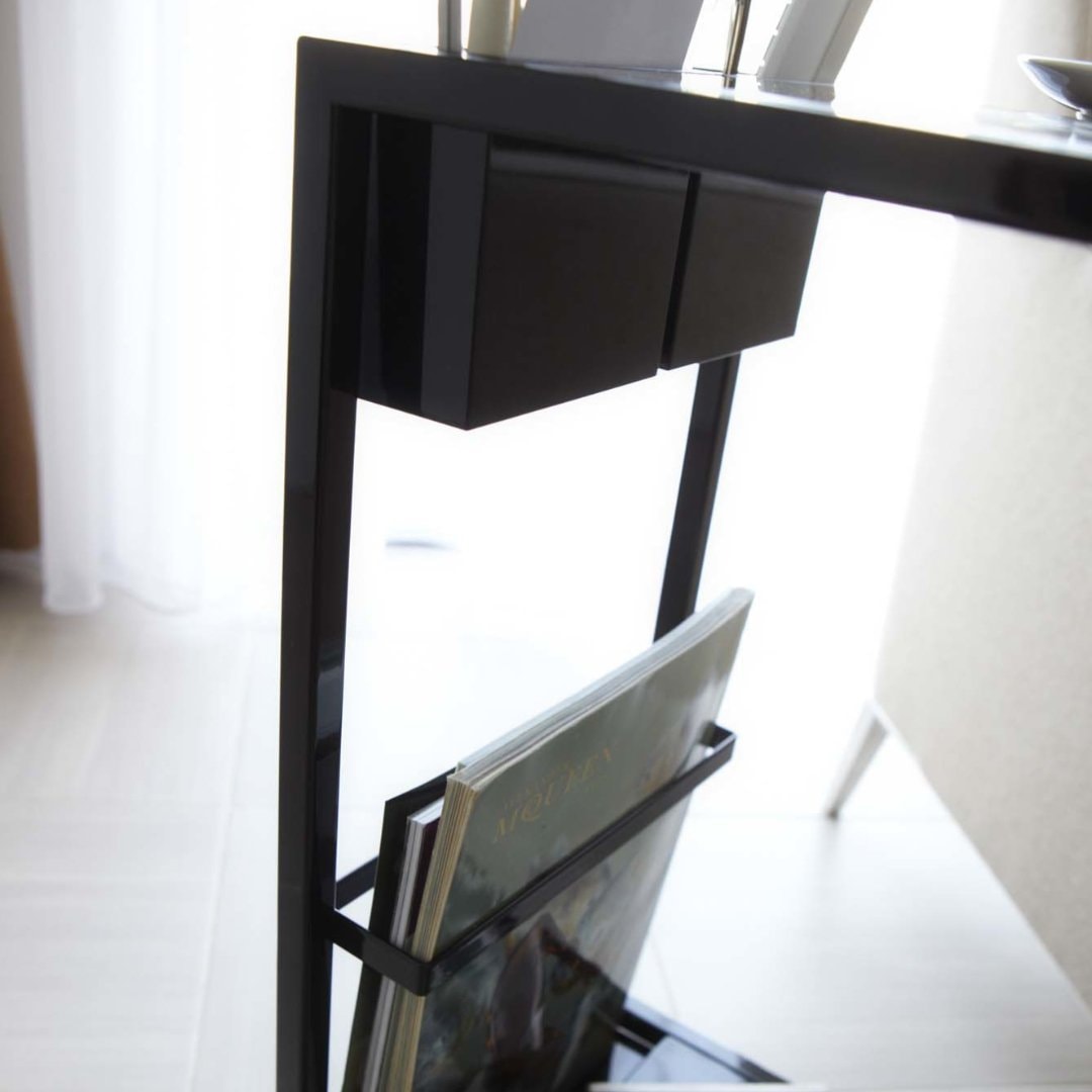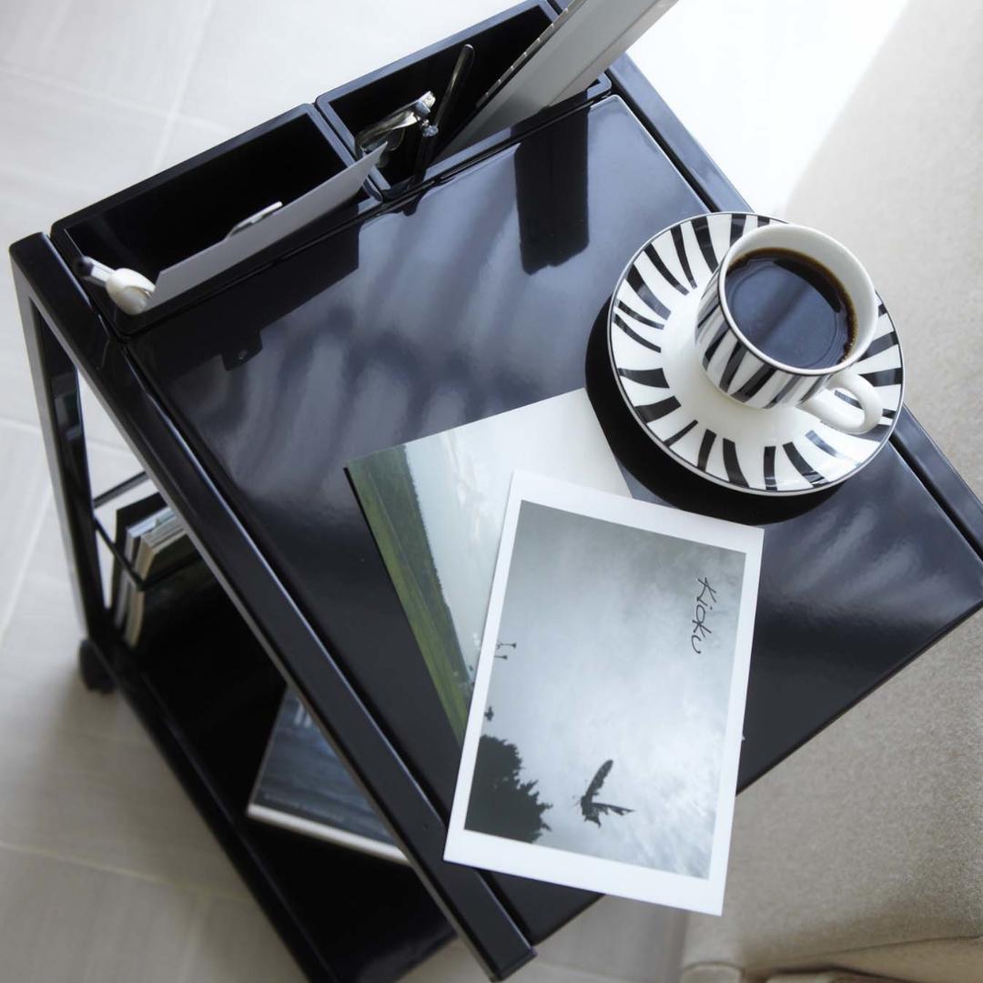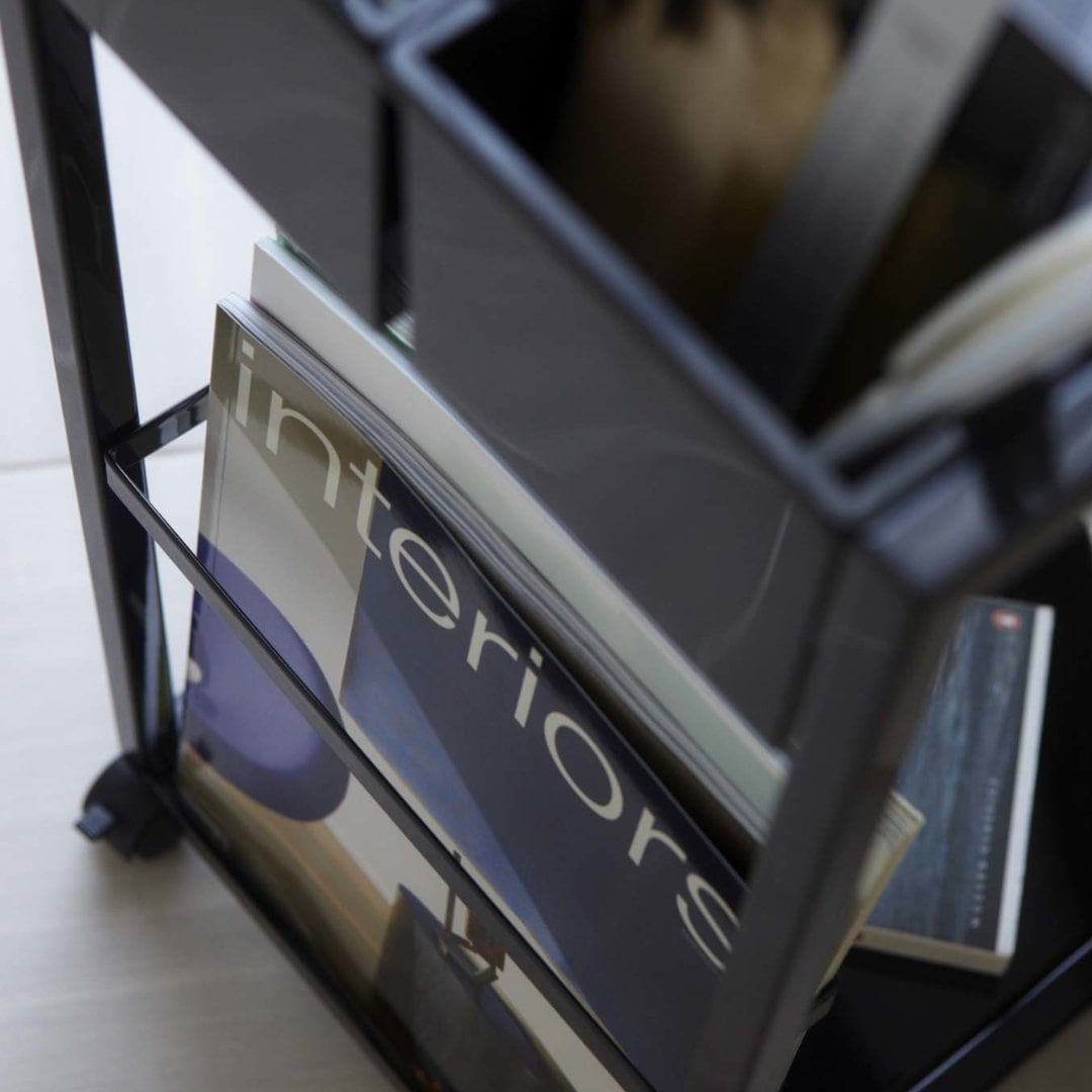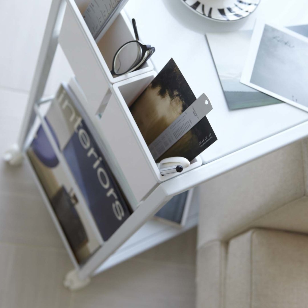 たくさんの機能があり使いやすいサイドテーブルワゴン サイドテーブルワゴンタワーは、多機能で使いやすいデザインが魅力的なアイテムです。まず高い位置にあるテーブル(棚)。ソファに座った状態でもちょどいい高さにテーブルがあるので、飲み物などを置いたり、軽くメモしたりするのにぴったりです。背面側には2つの小さめなポケットがついています。細かいものを収納するのに向いています。ポケットの下にはブックスタンドが付いているので、よく読む雑誌などを収納できます。また、下部にもテーブルと同じサイズの棚が付いていて「ちょっと置いておきたい」ときに使えてとても便利。上下の棚は5キロまで乗せられ、少し重いものを置いても、キャスターが付いているので楽に移動できます。カラーはホワイト、ブラックの2色から選べます カラーバリエーションはどんな部屋にも合うホワイト、ブラックの2色展開。明るく清潔感あふれるホワイト、スタイリッシュでキリリとした印象のブラック。お部屋のイメージに合わせて選んでみてください。