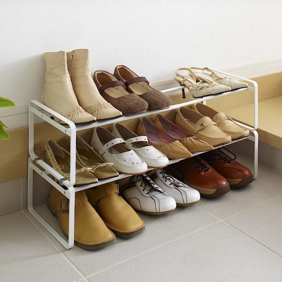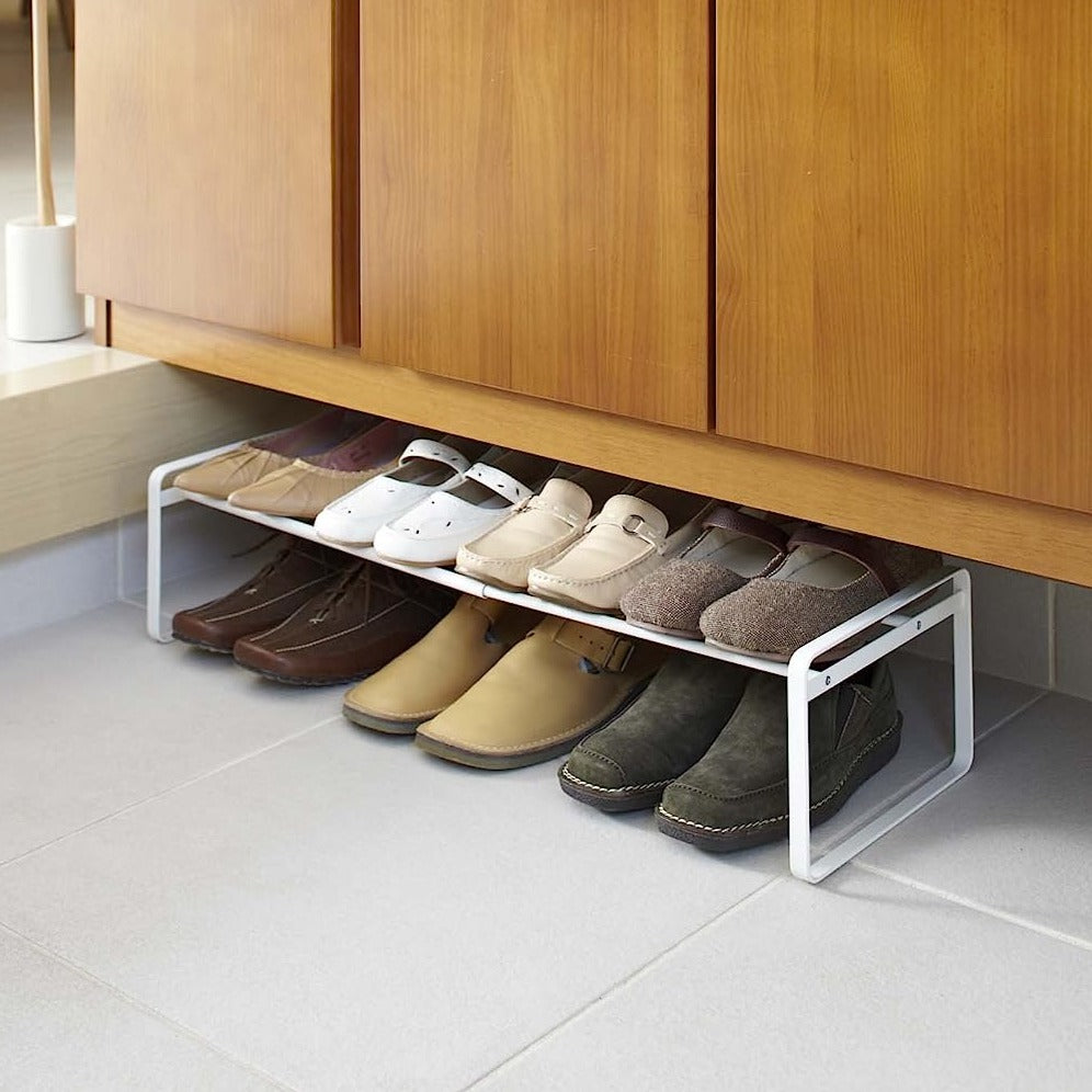 下駄箱からあふれた靴を下駄箱下にまとめて一括収納できるシューズラックです。玄関の靴箱の下にコンパクトに収納できます。男性のシューズなら約6足、ヒールなら約8足まで収納可能です。