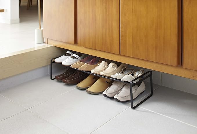下駄箱からあふれた靴を下駄箱下にまとめて一括収納。 玄関の靴箱の下に収納できるコンパクト設計シューズラック。 男性のシューズなら約6足、ヒールなら約8足収納可能。