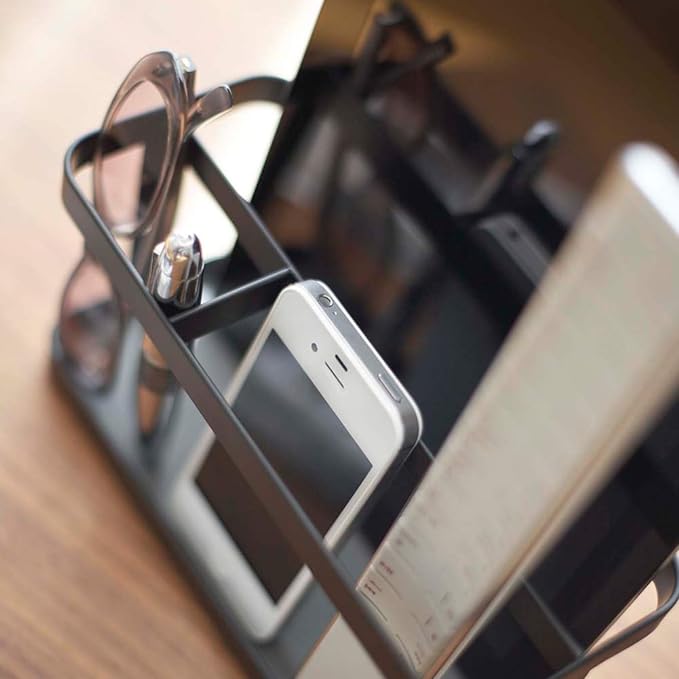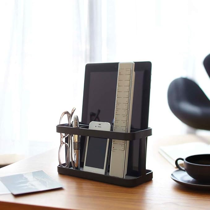 奥には様々なサイズのタブレットPCをすっきり収納。手前にはリモコン、携帯電話、ペン、メガネ、DMなど、リビングまわりの小物をまとめて収納。タブレットPC、スマートフォン、リモコン、リビングまわりの小物を一括収納。