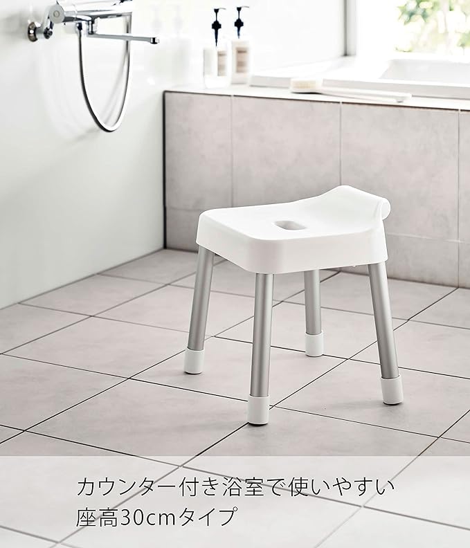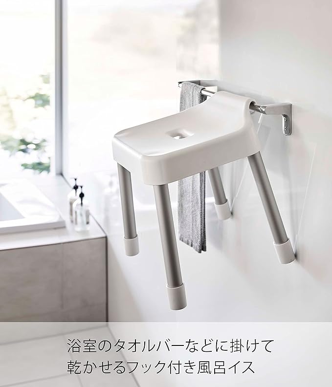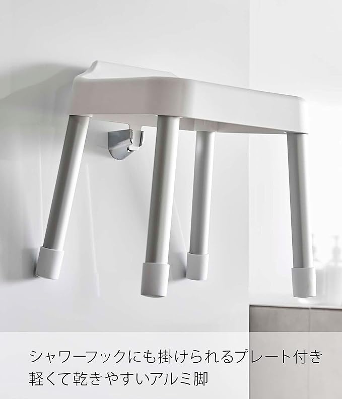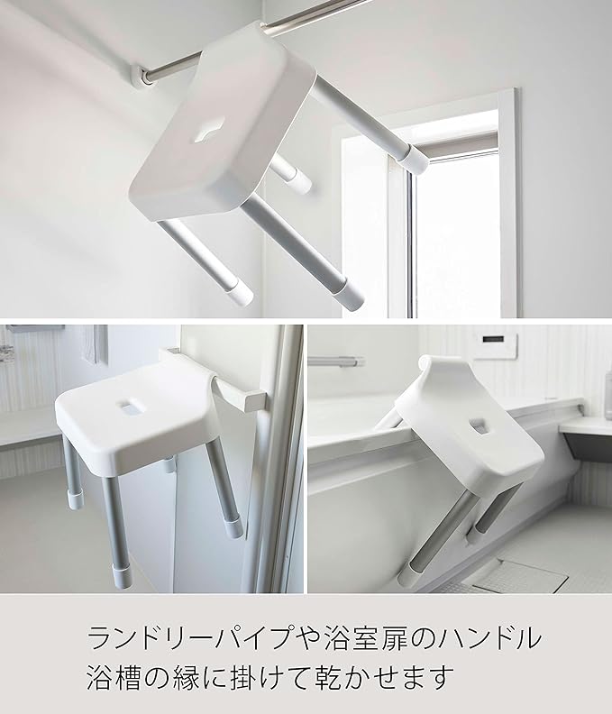 浮かせて収納できるので衛生的。浴室のタオルバーなどに掛けて乾かせるフック付き風呂イス。カウンター付き浴室で使いやすい座高30cmタイプ。軽くて乾きやすいアルミ脚。シャワーフックにも掛けられるプレート付き。浴室のランドリーパイプに掛ければ、お風呂掃除の邪魔になりません。浴槽の縁に引っ掛けて乾かせます。浴室扉のハンドルにも。背もたれ付きでゆったり座れます。