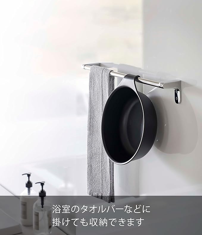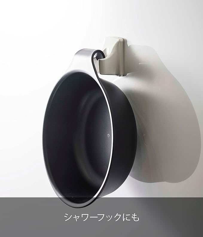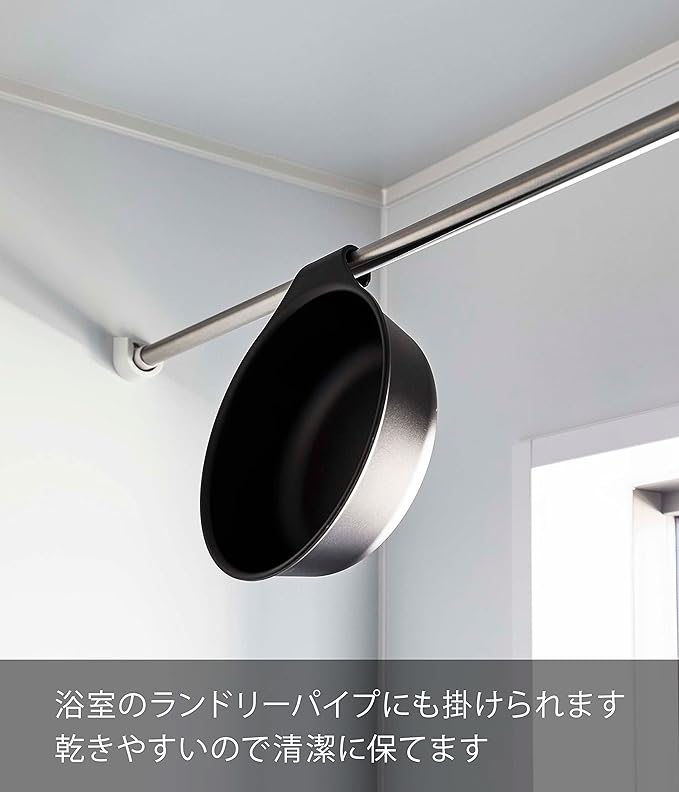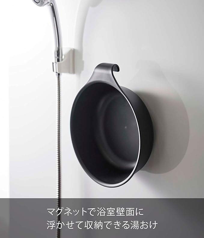 マグネットで浴室壁面に浮かせて収納できる湯おけ。マグネットが埋め込まれているのでお好みの位置につけられます。浴室のタオルバーや浴室扉のハンドル、浴室のランドリーパイプやシャワーフックなどに掛けて収納もできます。