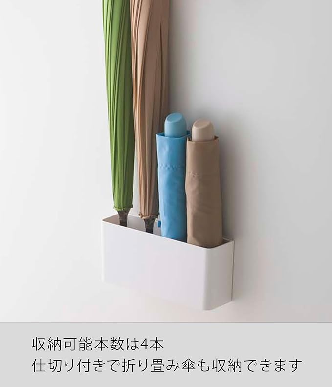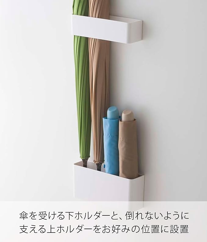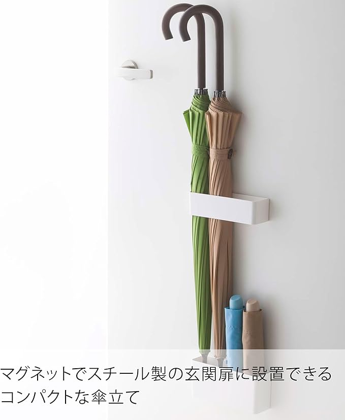 ドアがコンパクトな傘の収納スペースになるアイテムです。強力磁石で取り付け自在。マンションの鉄製扉など、磁石のくっつくあらゆる場所に取り付け可能。下ホルダーは仕切りを利用して折り畳み傘を収納可能。