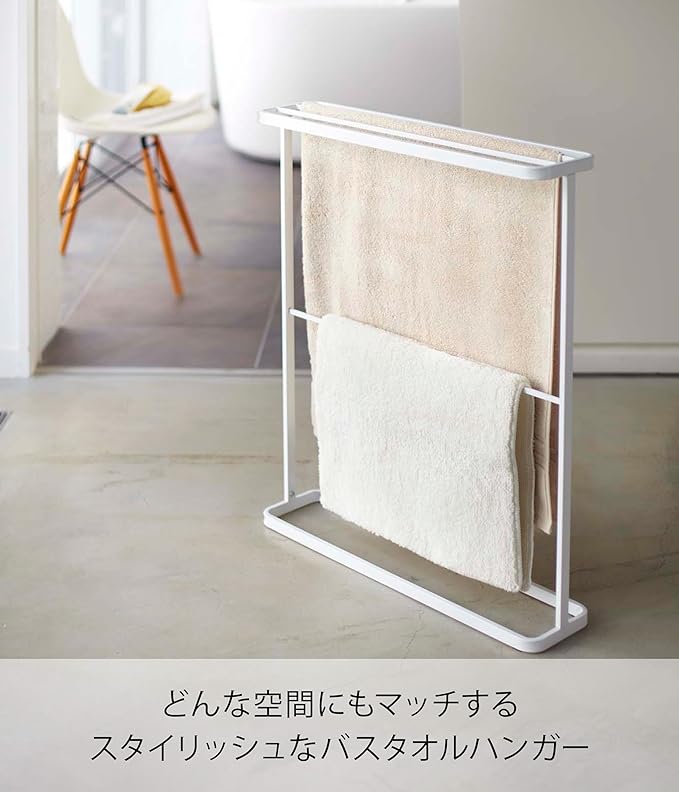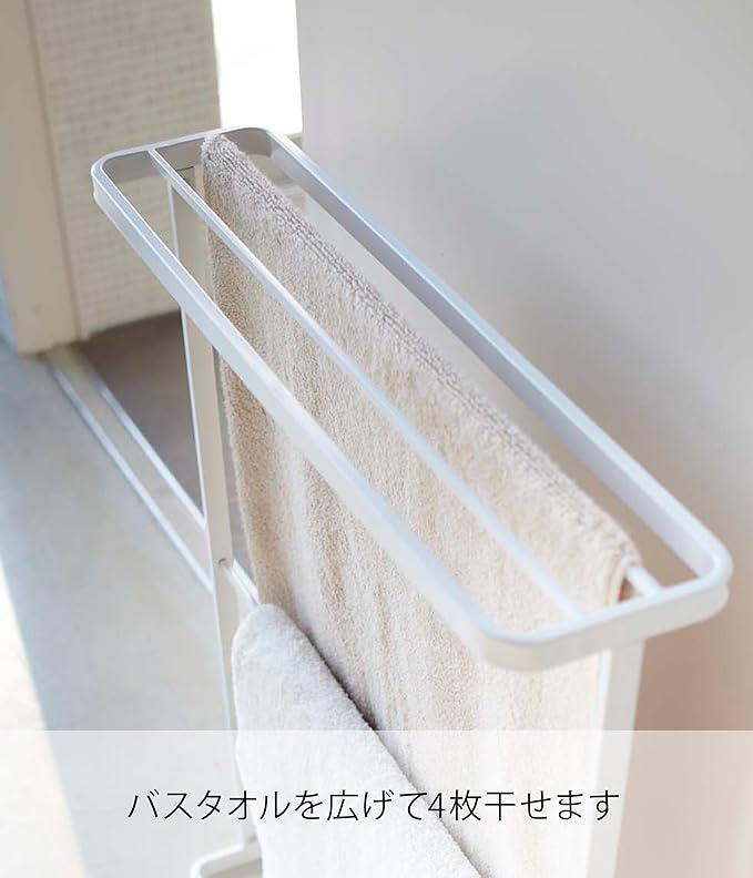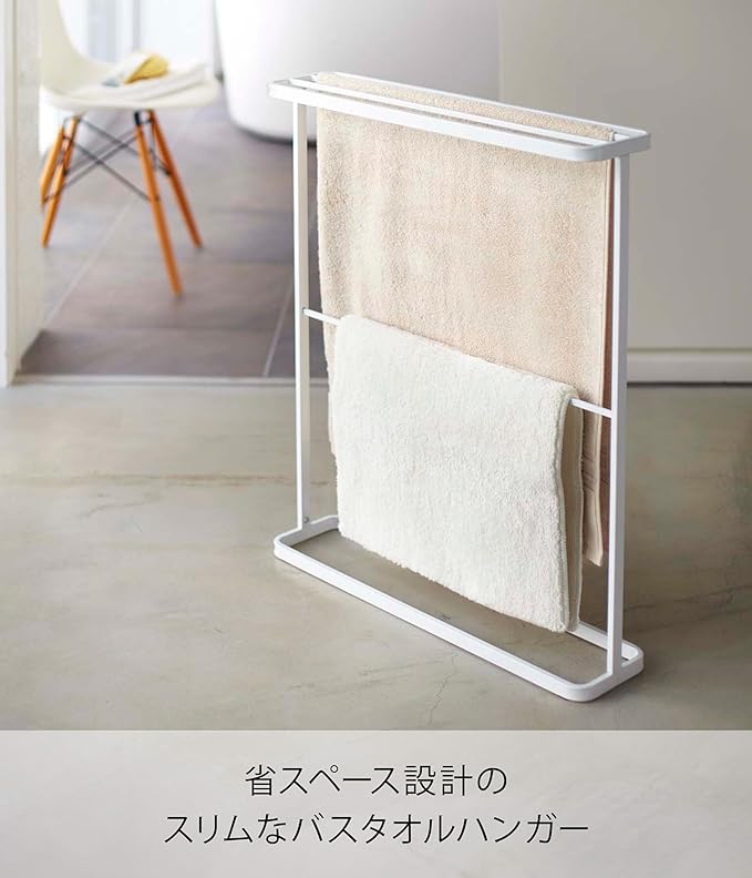 上部にバスタオルを4枚、下部にはバスマットも干せます。どんな空間にもマッチする省スペース設計のスリムなバスタオルハンガーです。壁に設置できるスリムでスタイリッシュなバスタオルハンガー。
