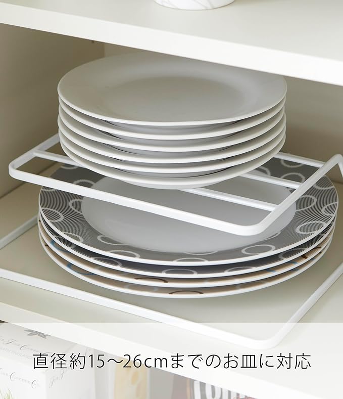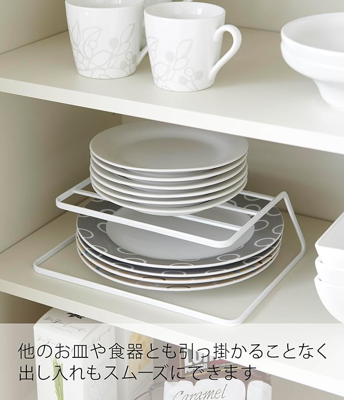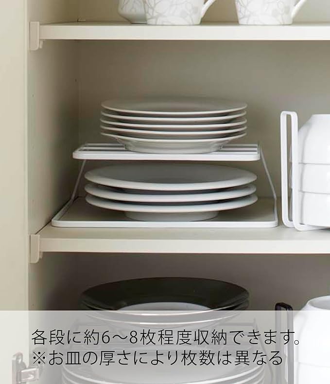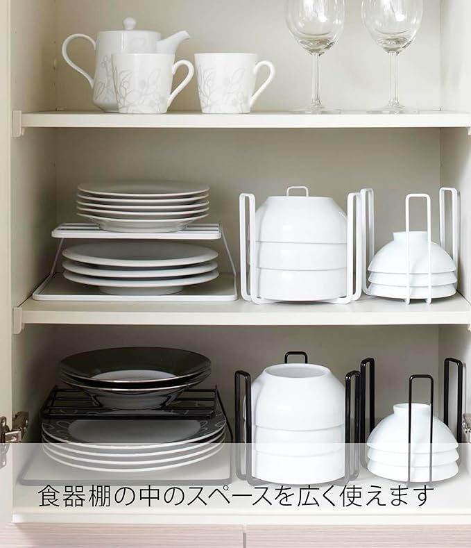 食器棚の散らかりがちなお皿を一括収納、出し入れ簡単。 食器棚の散らかりがちなお皿をすっきり収納、出し入れ簡単。下段は大きな重いお皿を置き、上段は小さくて軽量のお皿を置くとバランスよく収納できます。