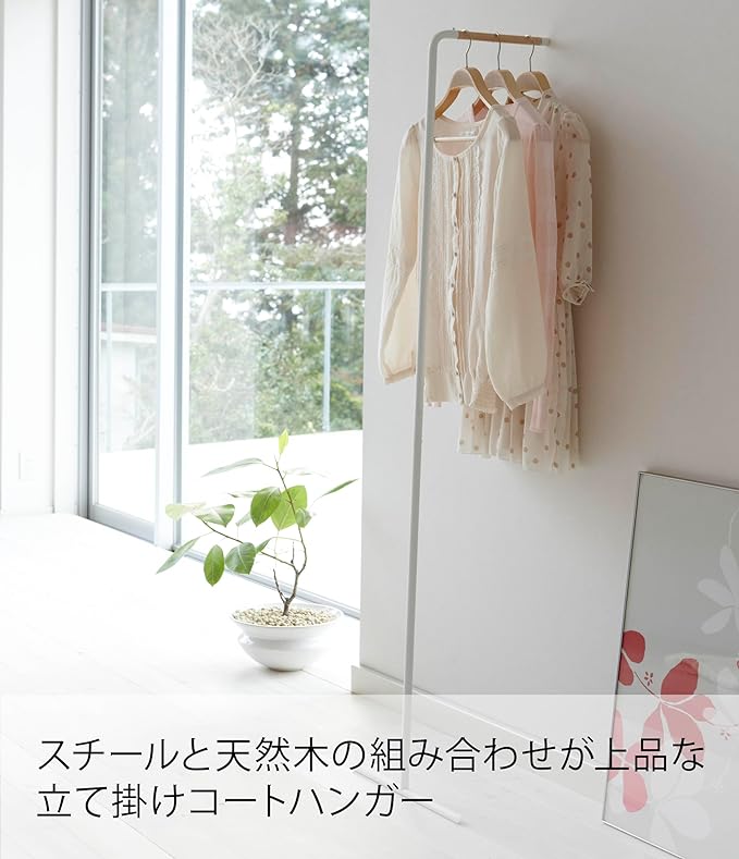 木目がやさしいシンプルなデザインの立て掛けコートハンガー。スチールと天然木の組み合わせが上品なコートハンガー。省スペース設計なので置く場所を選びません。