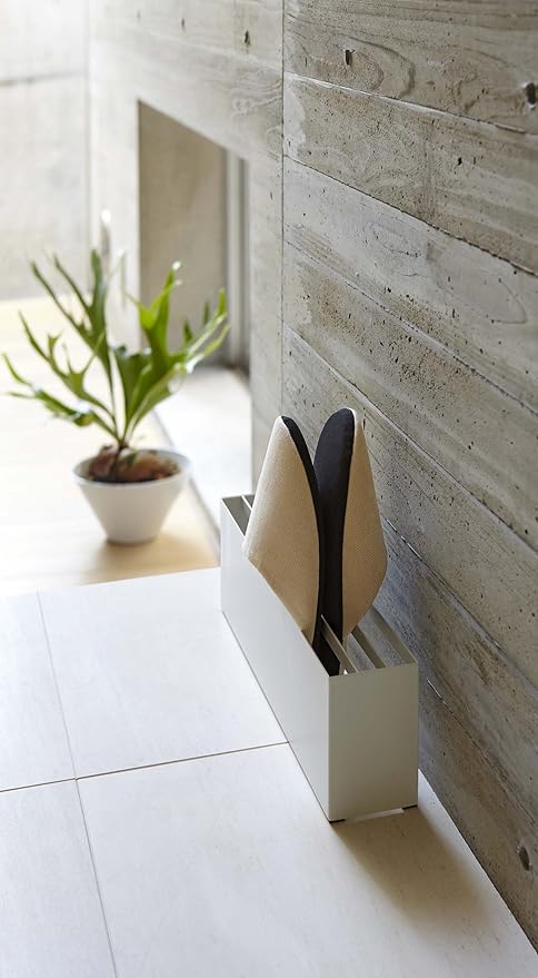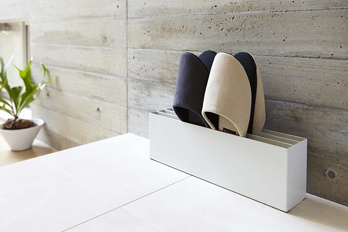 壁に沿うようにスッキリ収まるヨコ型スリッパラックです。圧迫感がなくスマートな空間を演出 スリッパの裏面を重ねて4足収納できます。横置きのスリム設計。玄関靴箱横や廊下やリビングなど場所をとらずすっきり収納できます。安定感もしっかりで使いやすさと機能性を重視したスリッパラック。玄関の壁にぴったりと収まるコンパクト角型のスリッパラック。スリッパラックの裏はあいており、掃除がしやすい構造になっています。