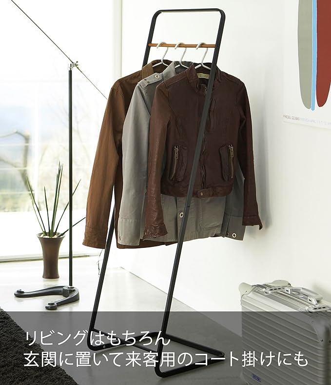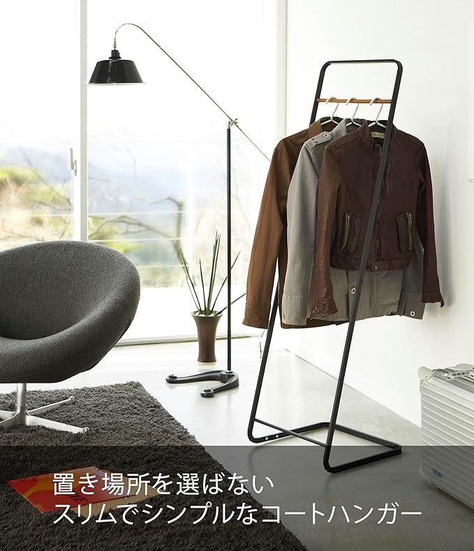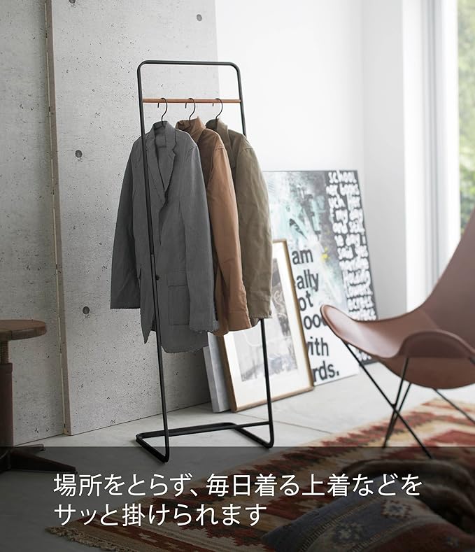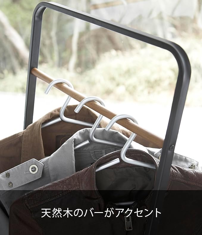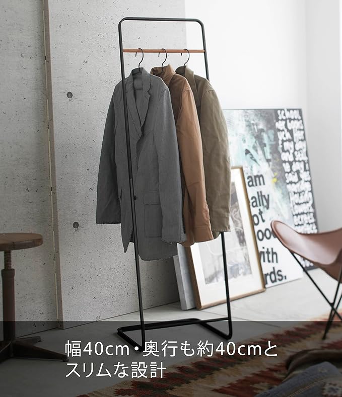 幅40cmとスリム設計で、置き場所を選ばないすっきりとしたデザインのコートハンガーです。モノトーンのスタイリッシュなマットスチールに、天然木のバーで温かみがプラスされたシンプルなデザイン。どんなインテリアにも馴染みやすく、置くだけでおしゃれな空間に仕上げてくれます。お気に入りのお洋服を"魅せて"収納でき、またコーディネート中や来客時の一時掛けにも便利。狭いお部屋に置いても圧迫感がなく、リビングや寝室、玄関など、場所を問わずお使いいただけます。