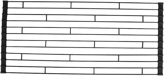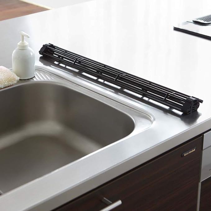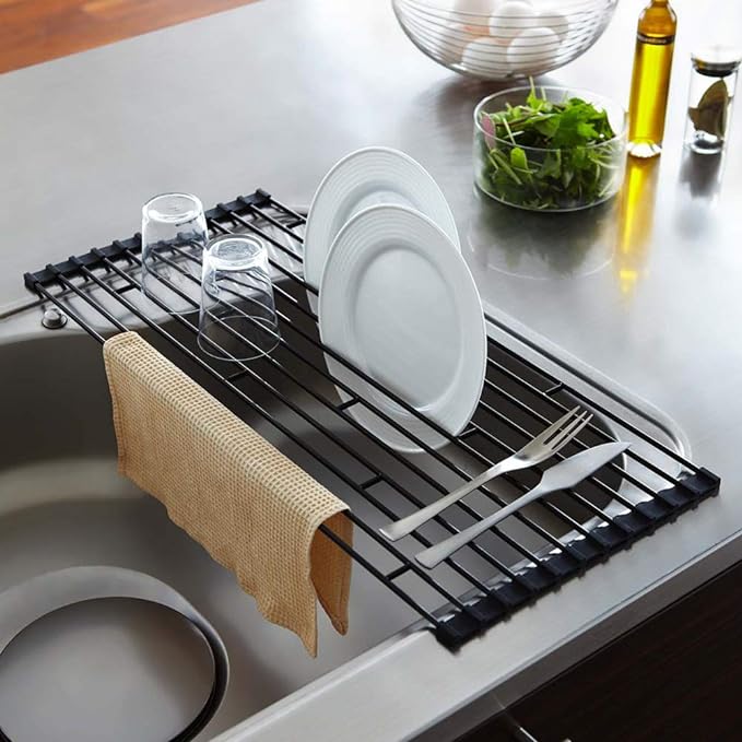 布巾を干したり、小皿を立てて乾かすことができる折り畳み水切りラック。調理台の延長として使ったり、料理の盛り付けスペースにもなって便利。量が少ない時など、使いたい幅に折って水切りも可能。キャップとワイヤーが取り外せるので水道の蛇口を避けて設置することもできます。使わない時はクルッと巻いてコンパクトに収納できます。