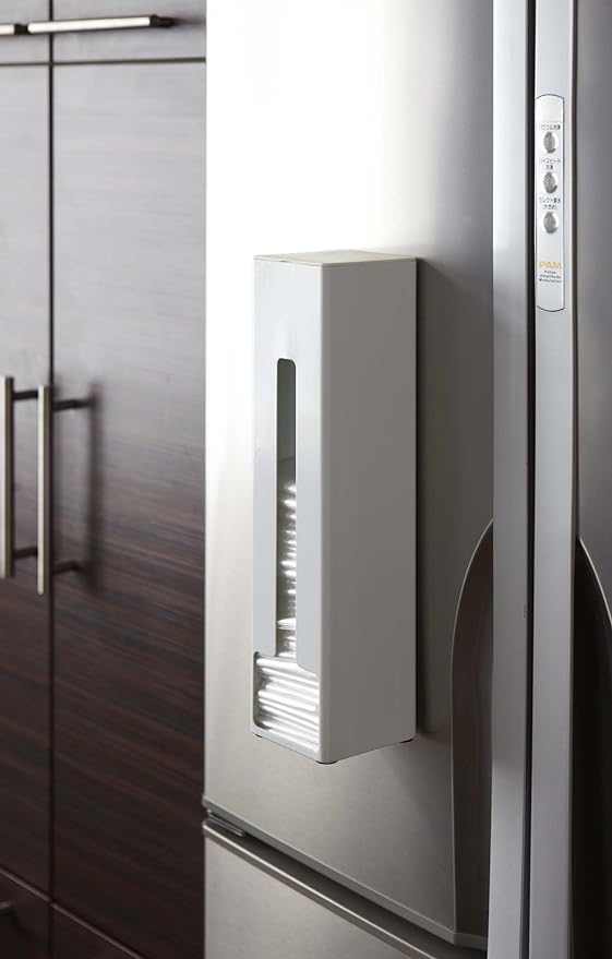 シンプルでスタイリッシュなレジ袋ストッカー。折り畳んで収納すれば約30枚のポリ袋を収納可能で一枚ずつサッと取り出せます。ポリ袋を畳まず、丸めて収納しても取り出せます。付属のマグネットで冷蔵庫の扉や側面に貼り付けることも可能。