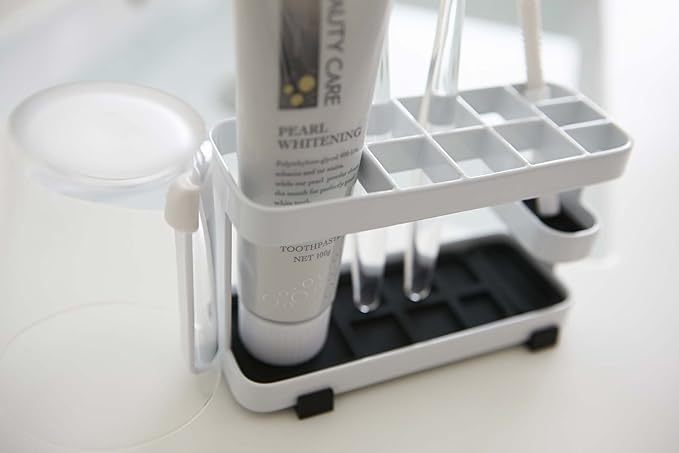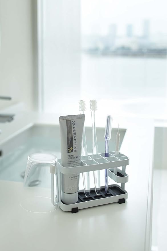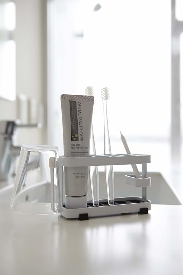 歯ブラシ・歯間ブラシ・歯磨きチューブ・タンブラーを一括収納。 歯ブラシ6本・歯間ブラシ3本・歯磨きチューブ・タンブラーを収納できます。シンプルな設計でお手入れしやすく、いつも清潔に使用できます。接地面の傷防止にクションがついていて安心。