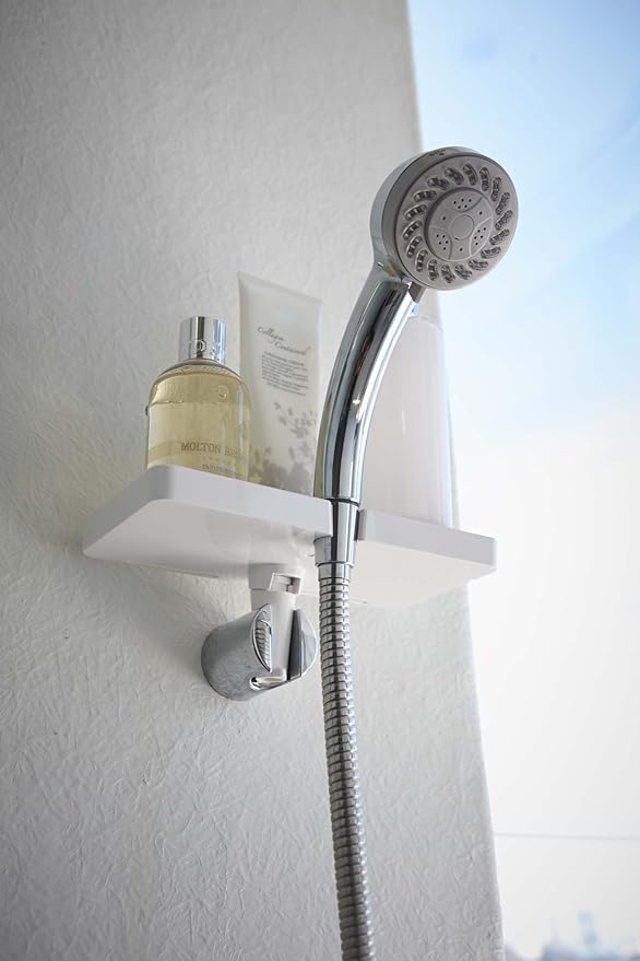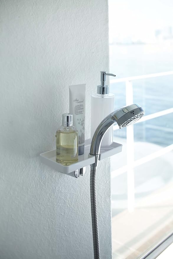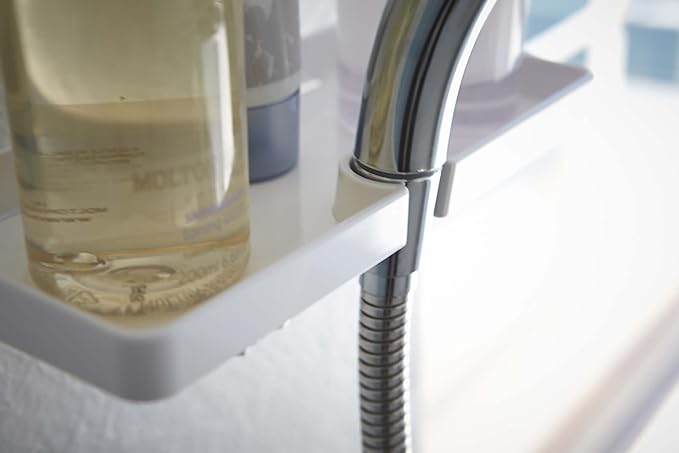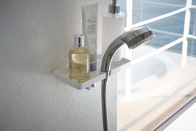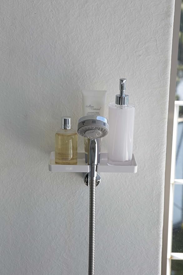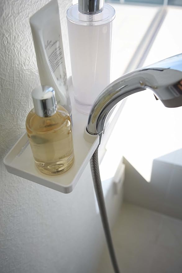シャワーホルダーに差し込むだけの簡易バストレイ。ユニットバスなどの狭いバスルームにぴったり。ディスペンサー・洗顔チューブ・ソープトレイ・歯ブラシスタンド・タンブラーなど、置き場所に困っていたバスグッズを収納できます。
