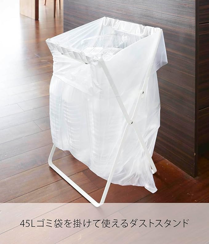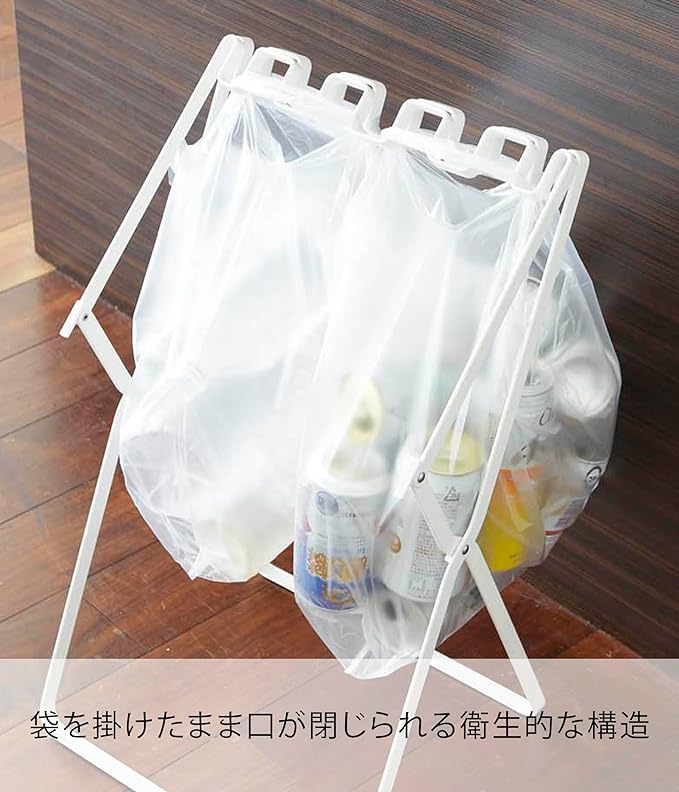 45Lゴミ袋とレジ袋を掛けられる開閉式ダストスタンド。45Lのゴミ袋がフレームに直接掛けられます。ズレ防止用マグネットで袋が落ちる心配もありません。レジ袋を掛ければ、分別も可能。折り畳むと厚さ3.5cm。冷蔵庫横のすき間に収納でき、持ち運びが簡単なのでアウトドアでも使えます。レジ袋を使って分別もOK。2~4分別が可能です。 45Lのゴミ袋を直に掛けられます。ズレ防止付き。袋を掛けた状態で口が閉じられる衛生的な構造。