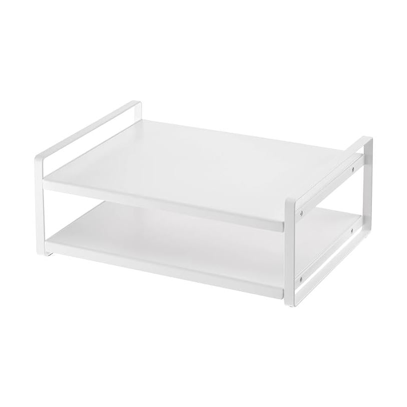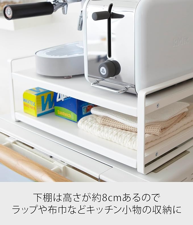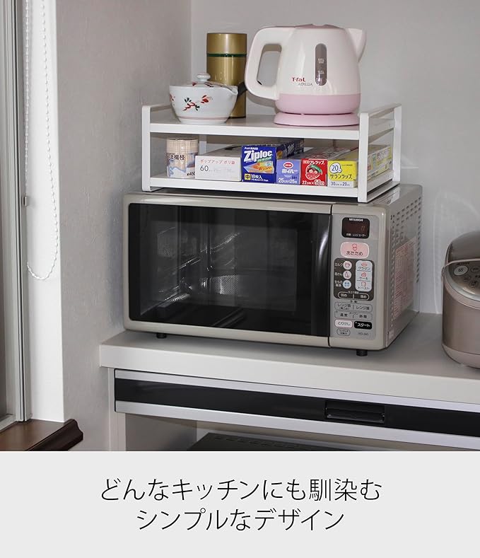 デッドスペースを有効活用した、レンジ上ラック 電子レンジや冷蔵庫の上のスペースを活用できる収納ラックです。キッチンは調理家電や食器、調味料など物が多くなりがちですが、限られたスペースの中で収納力をアップしてくれるのに便利なアイテムです。小物類が入る下段と、高さのある家電が置ける上段の2段タイプで、使いたいアイテムをサッと取り出し・片付けもスムーズにできます。強度と安定感のある収納ラックが欲しい方におすすめです。選べる2色展開 カラーバリエーションはホワイト、ブラックの2色展開です。調理家電やインテリアに合わせて、お好みのカラーをお選びください。どんなインテリアにも合わせやすいカラーとシンプルなデザインなので、飽きがこず長く愛用できるのも嬉しいポイントです。二段に分けられた収納スペース高さが8cmの下段には、ラップや鍋敷きなどの小物類を収納できます。上段は仕切りがないので、トースターやコーヒーメーカーなどの高さのあるアイテムを収納するのに最適です。安定感のあるしっかり設計 各棚の耐荷重は3kgのしっかり設計です。小物も調理器具も多くなりがちなキッチンだからこそ、使用頻度の高いアイテムを見せる収納として置いておくのにぴったりです。ラック下のレンジとの設置部分には緩衝材が付いているため、傷防止や安定感にもつながります。お手入れ・組み立も楽ちん 水や汚れに強いスチール素材(粉体塗装)を採用しています。水はねや油はねで汚れても丸ごと水洗いでき、お手入れが簡単です。ドライバー1本あれば女性でも楽に組み立てられるのも高ポイントです。