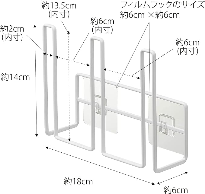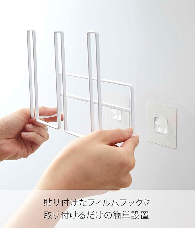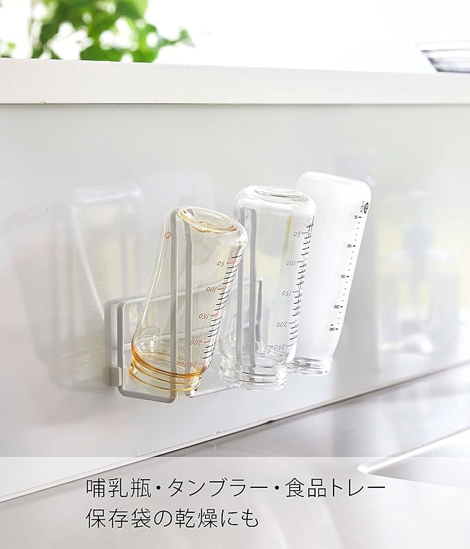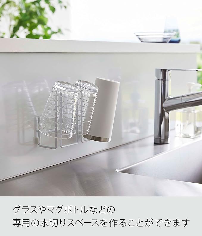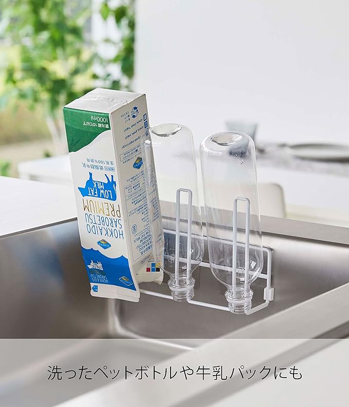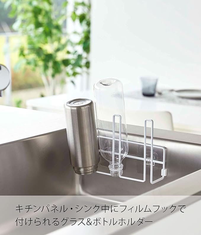 ボトルやロンググラスも安定感をもって乾燥 フィルムフックでキッチンパネルやシンク中に簡単取り付け。 乾くのに時間が掛かったり、安定して置きにくいボトルやグラスなどをサッと干せるホルダーです。哺乳瓶やタンブラー、食品トレーや保存袋の乾燥にもご使用いただけます。キッチンに合う、2色のカラーバリエーション カラーは、明るい印象のホワイト、スタイリッシュなブラックをご用意しました。どんなキッチンインテリアにもなじむモノトーンカラーです。キッチンタイルや調理家電の色などに合わせてお好みでお選びください。水筒やペットボトルの乾きが早く。 洗った水筒をそのままタオルの上などに立てて乾かすだけだと、風通りが悪くて翌日になってもまだ乾いてない、なんてことも。ホルダーを使って乾かせば空気の通り道ができるので水筒がより早く乾きます。ペットボトルの乾燥にも。すぐに倒れちゃう牛乳パックにも 洗った牛乳パックはリサイクル回収、まな板代わり、お菓子の型としてなどいろいろな用途に使うことも可能ですよね。軽くて細長い牛乳パックはそのままだと干しにくいですが、中に支えのあるグラス&ボトルホルダーなら洗って立て掛けるだけでしっかりと乾かせます。フィルムフックで簡単取り付け フィルムフックをお好みの位置にペタッと貼り付けるだけなので取り付けがとても簡単です。タイル・ステンレス・ガラス・人工大理石など、フィルムフックの設置面よりも大きく、光沢がある平らな面なら取り付けOK。