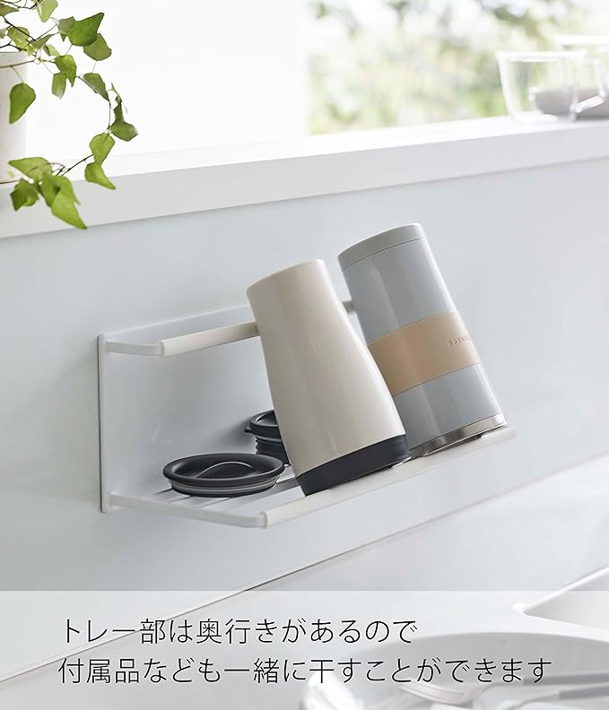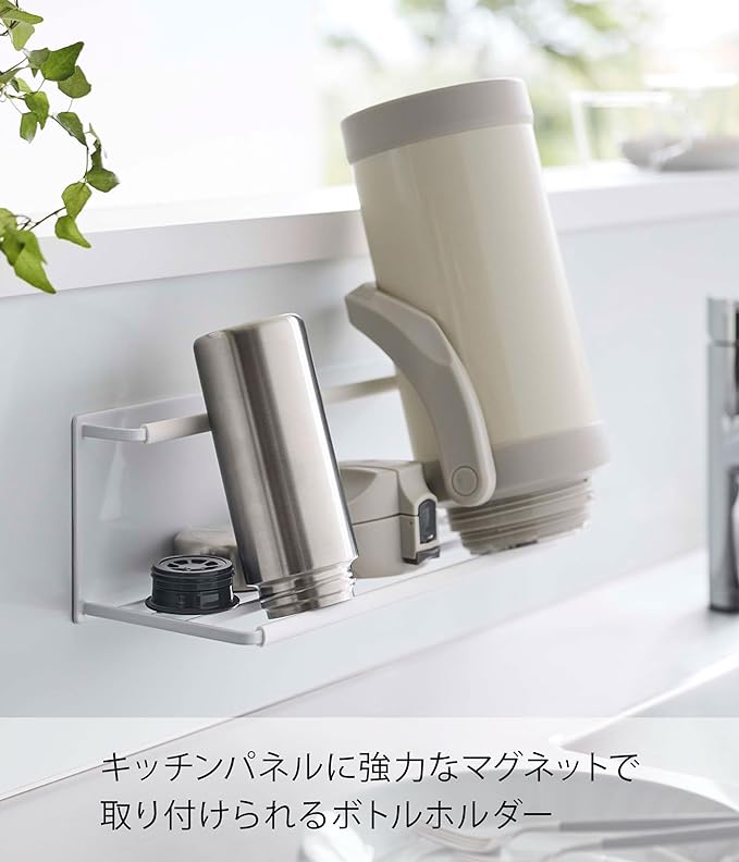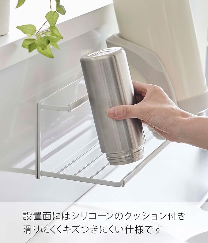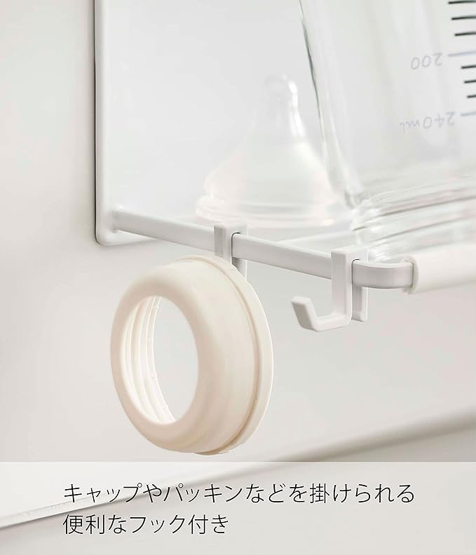 浮かせてたっぷり収納できるボトルホルダー 大判強力マグネットでしっかり貼りつく、ボトルホルダーです。洗った後の食器類と別に収納することで早く乾き、時間がないときでもサッと取り出せます。ワイドサイズなので哺乳瓶やタンブラー、マグ、ペットボトルなどを複数個立てかけられるアイテムです。浮かせて設置することで通気性抜群で、シンクまわりのお手入れもしやすいのが◎。好みで選べる2つのカラーバリエーション ボトルホルダーのカラーはホワイトとブラックのモノトーンカラーをご用意いたしました。どんな色合いのキッチンにもなじみやすいカラーなので、キッチンパネルやカウンターなどに合わせてお選びいただけます。キャップなどの小物も一緒に置ける、奥行きのあるワイド設計 200mL~2L以下のタンブラー・マグボトル・ジャグボトル・水筒、200mL以上の哺乳瓶、グラス、マグの収納が可能です。ラック部分は奥行きがあるので、ボトルやマグを立てかけた後ろにキャップやパッキンなどの小物も一緒に干せて便利です。サッと置いても安定感のある滑り止め付き マグネットがつく平らな面やスチール壁面に取り付け可能です。収納物との設置面にはシリコーン製の滑り止めが付いているのでサッと置いても滑りにくく、キズつきにくい仕様になっています。小物を掛けられる便利なフック付き 取り外し可能なフックが2つ付いているので、キャップやパッキンなどの小物類を掛けておくことができます。フック一つあたりの耐荷重は250gとしっかりしているので、重さのあるものの収納にも安心です。