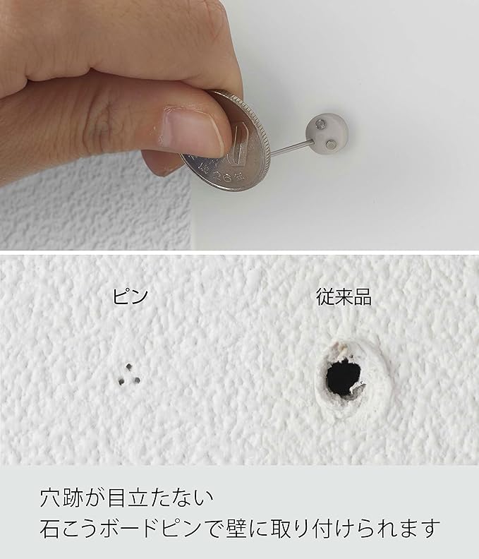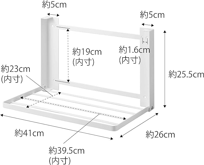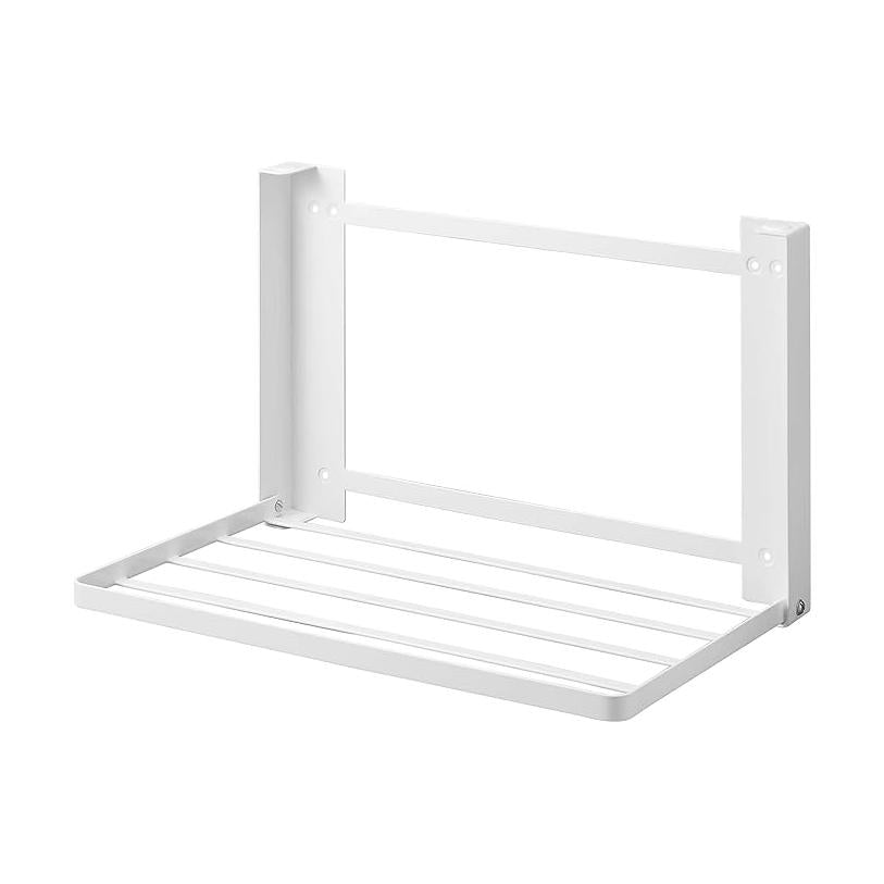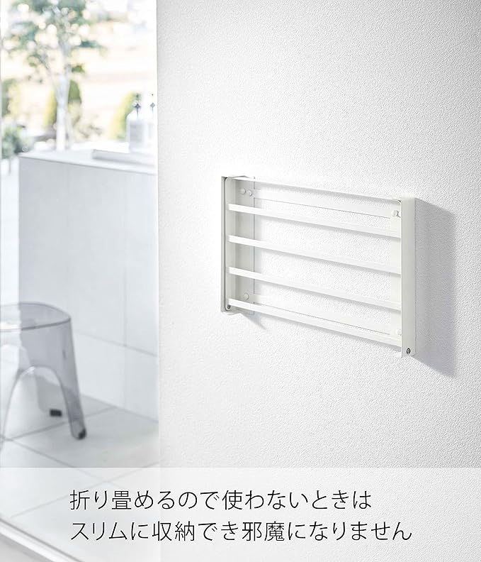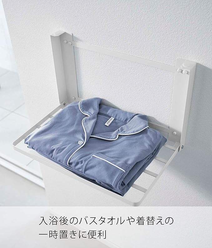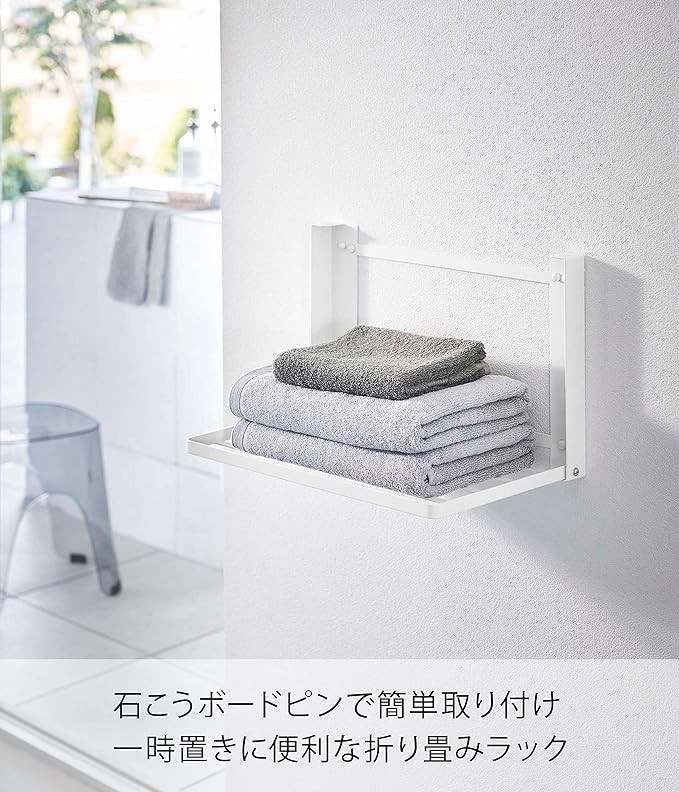 スリムで邪魔にならない。折りたたみ棚 入浴後の着替えやバスタオルなどを一時置きできる便利な折り畳みラックです。付属の石こうボードピンで簡単に取り付けられます。使わないときは折り畳んでおけば、奥行き4cmのスリムさ。省スペースな脱衣所でも邪魔にならない薄さがうれしいポイント。脱衣所にもなじむ、2色のカラーバリエーション カラーは、明るい印象のホワイト、スタイリッシュなブラックをご用意しました。無駄のないシンプルなデザインとモノトーンカラーは、脱衣所にもよくなじみます。脱衣所の雰囲気やお持ちのタオルの色などに合わせてお好みのカラーをお選びください。お風呂上がりのバスタオルの位置はここ。 お風呂上がりの着替えやバスタオルの置き場所を固定化。バスルームの扉からサッと手の届きやすい位置に取り付けて暖まった体を冷やさない。 一目で着替えとタオルだとわかるので、来客時にも親切でやり取りがスムーズです。取り付けラクラクな石こうボードピン 石こうボードピンで取り付けられるので、ラックを取り外した場合でも穴が小さく目立ちにくいのがうれしいポイント。コインを使って簡単に設置できちゃいます。力がいらないので女性でも簡単に取り付けが可能です。バスタオル収納、タオルハンガーとして 常に開いたままにしておき、バスタオル用の収納棚としてもお使いいただけます。収納の少ない一人暮らしのお部屋にもぴったりです。濡れたタオルを乾かすタオルハンガーとしてもお使いいただけます。