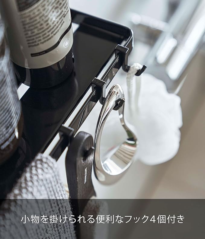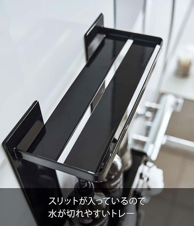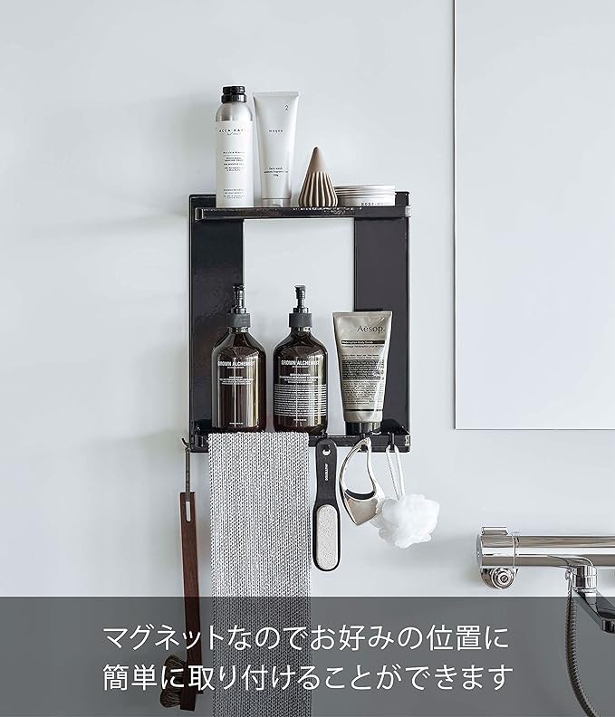 散らかりやすいバス小物を整理できる2段のラックをマグネットで簡単取り付け。マグネットで浮かせて収納できます。使いやすい高さに調節できて、バス小物をスッキリと収納できます。スリットが入っており水が切れやすいトレー。フチにタオルを掛けたりフックを取り付けることができます。小物を掛けられる便利なフック付き。棚が2段あるので小物が多くてもスッキリ収納できます。