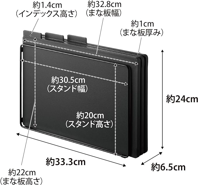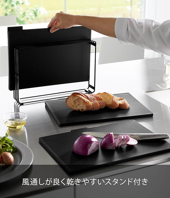 使い分けができるまな板3枚セット。風通しが良く乾きやすいスタンド付きで衛生的です。インデックス付きのまな板3枚セット。肉・魚・野菜など食材に合わせて使い分けができます。SIAAの基準を満たした抗菌加工済み。食洗機対応でお手入れもラクラク。縦横どちらでも置けるデザイン。まな板は裏表で違う形状です。片面はフラット、もう片面はフチ付きで水分が調理台にこぼれるのを防ぎます。滑り止め付きでスムーズに食材をカットできます。