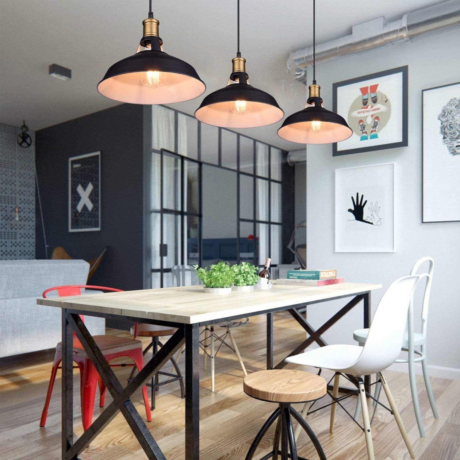 外側の真っ黒ランプシェードと内側の真っ白装飾のコントラストが特徴のペンダントライトです。ランプシェードで灯りを付ければ空間を引き締めます。